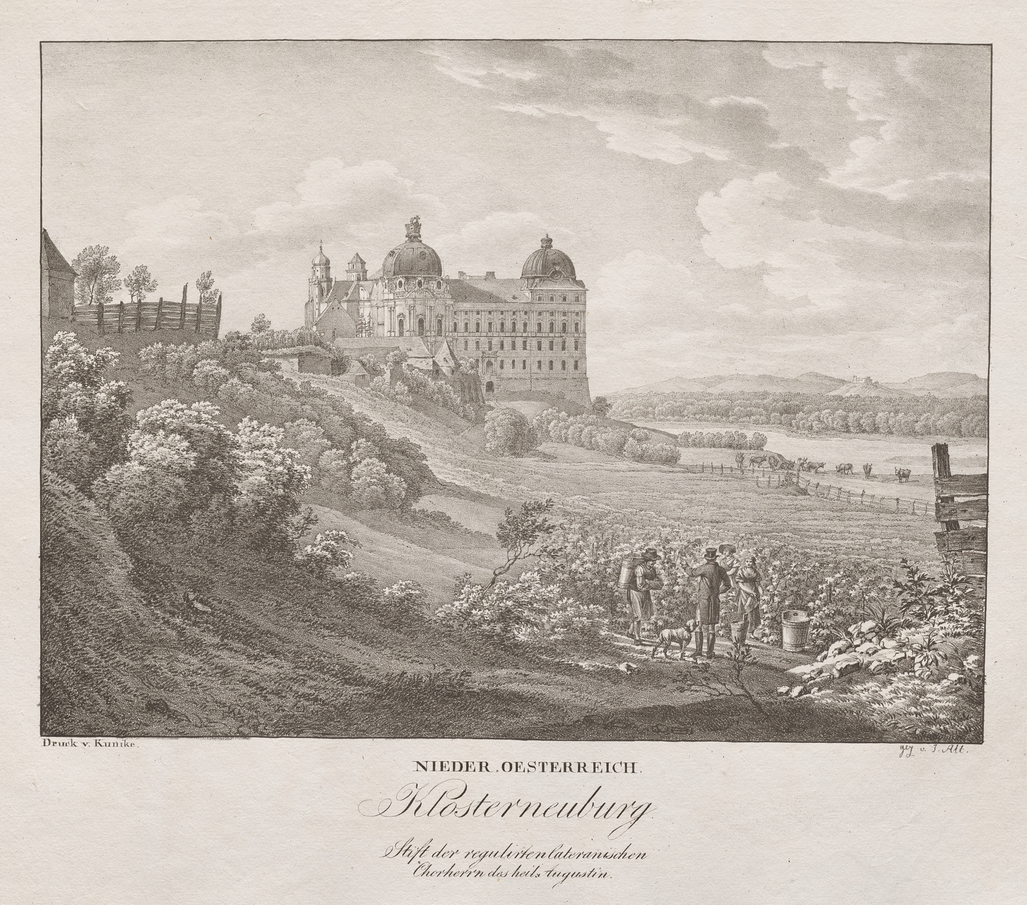 The image shows a landscape scene with a large building and several people in the foreground. The large building has two domes, one on either side of a central section with many windows. The building appears to be on a hillside with trees and bushes to the left. In the foreground, there are people and a dog on a path leading down to a garden or field with flowers and a fence. There are also trees, hills, and a cloudy sky in the background. The image is in black and white. The title "Nieder-oesterreich, Klosterneuberg by Jakob Alt" is written at the bottom.