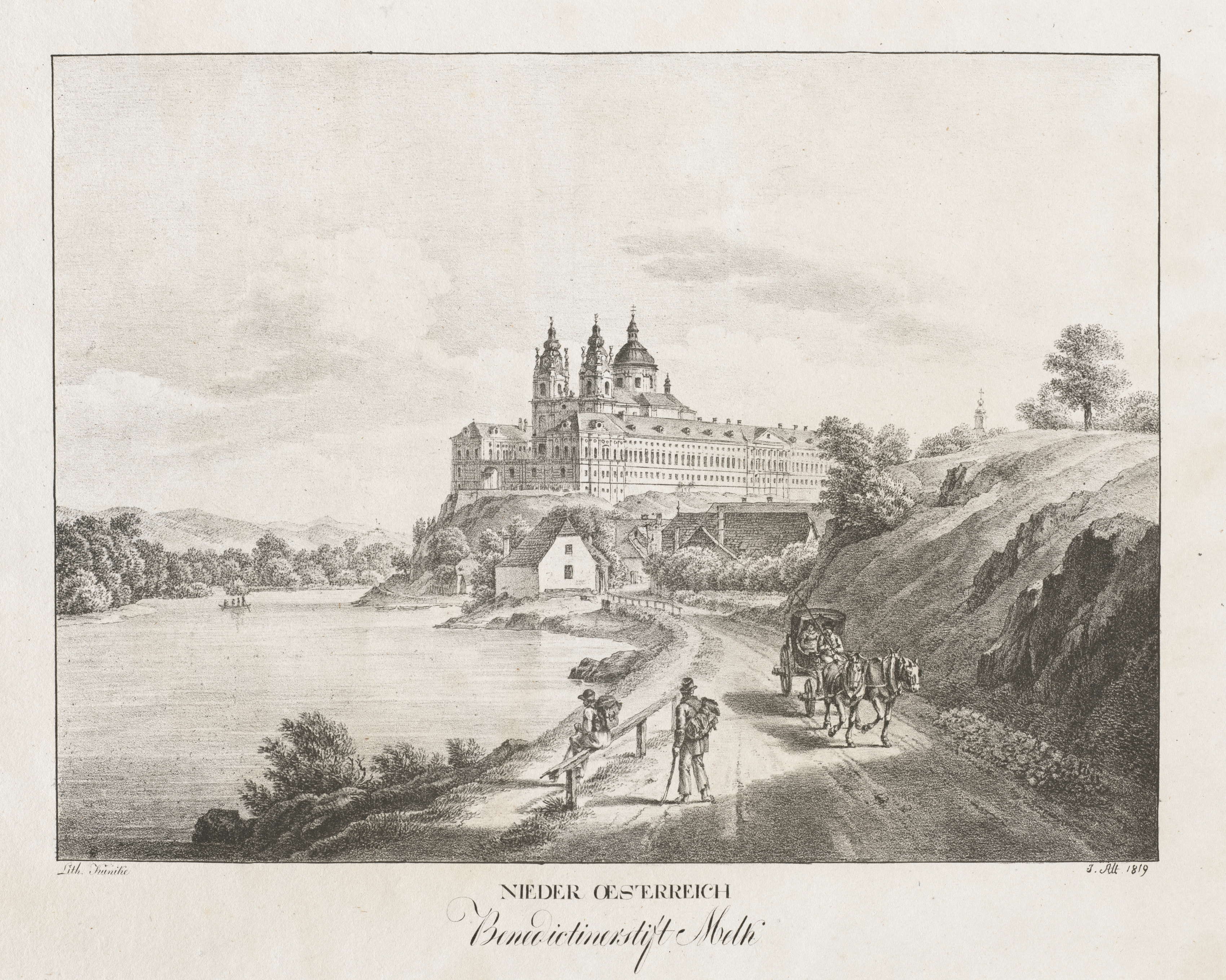 Black and white illustration of a large building on top of a hill. The building has multiple towers and a dome. There are two horse-drawn carriages on a road leading to the building. The road runs along a body of water on the left. Two people are walking on the road. There are trees and hills in the background. The sky is cloudy. The text at the bottom reads "NIEDER OSTERREICH" and "BENEDICTINERSTIFT MELK".