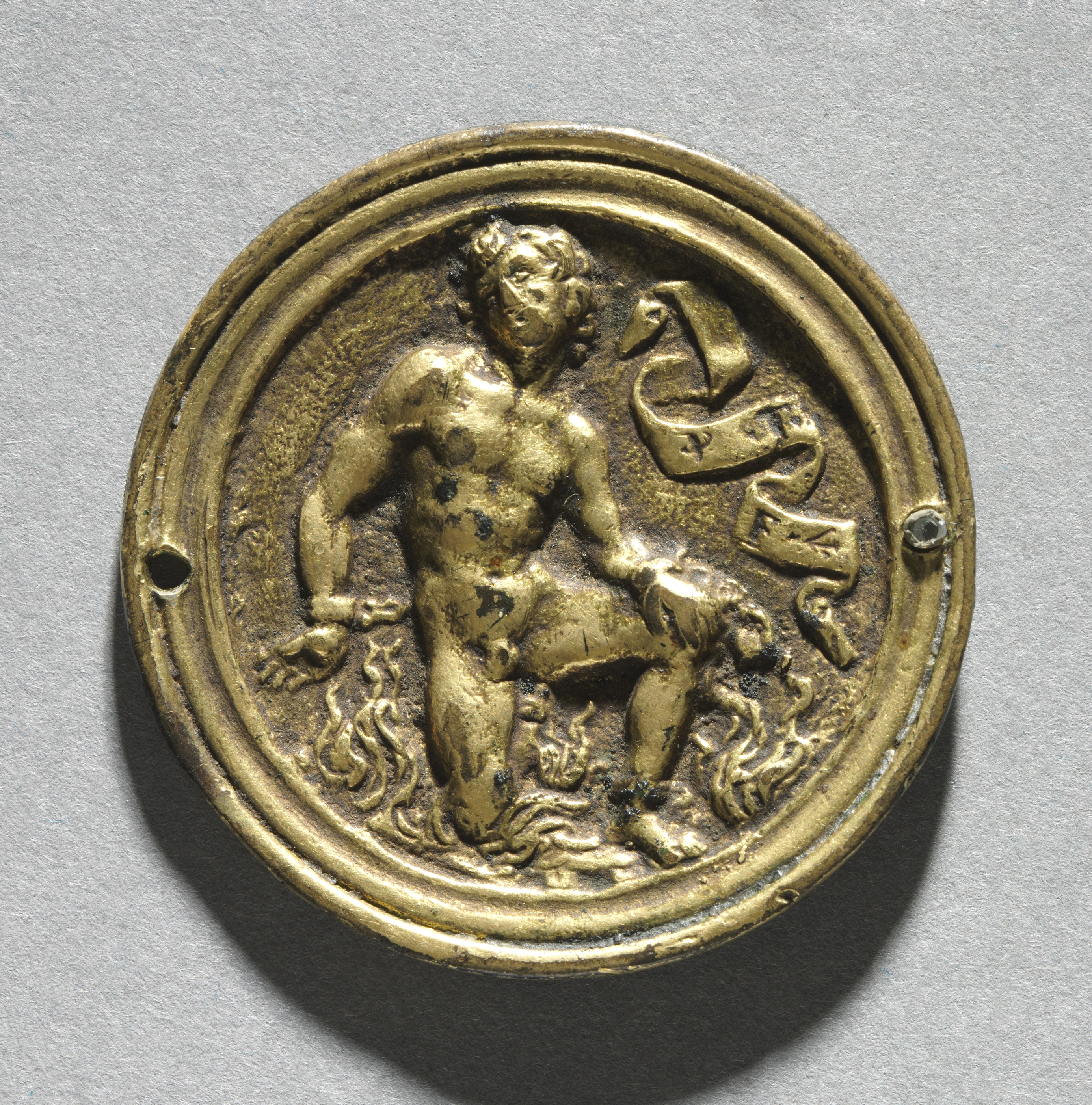 The image depicts a gold-colored, circular object, possibly a medallion or seal, with a raised design. The object has a raised outer rim and a smaller raised inner rim. The center of the object features a raised figure of a man with curly hair, wearing a cloth wrapped around his waist. He appears to be standing on flames. His right arm is bent at the elbow, and his left arm is extended downward. To the right of the man, there are some raised, abstract shapes. The object has two small holes on either side, possibly for attachment. The background is a light gray surface, with shadows cast by the object. The object titled "Allegory" by the artist.
