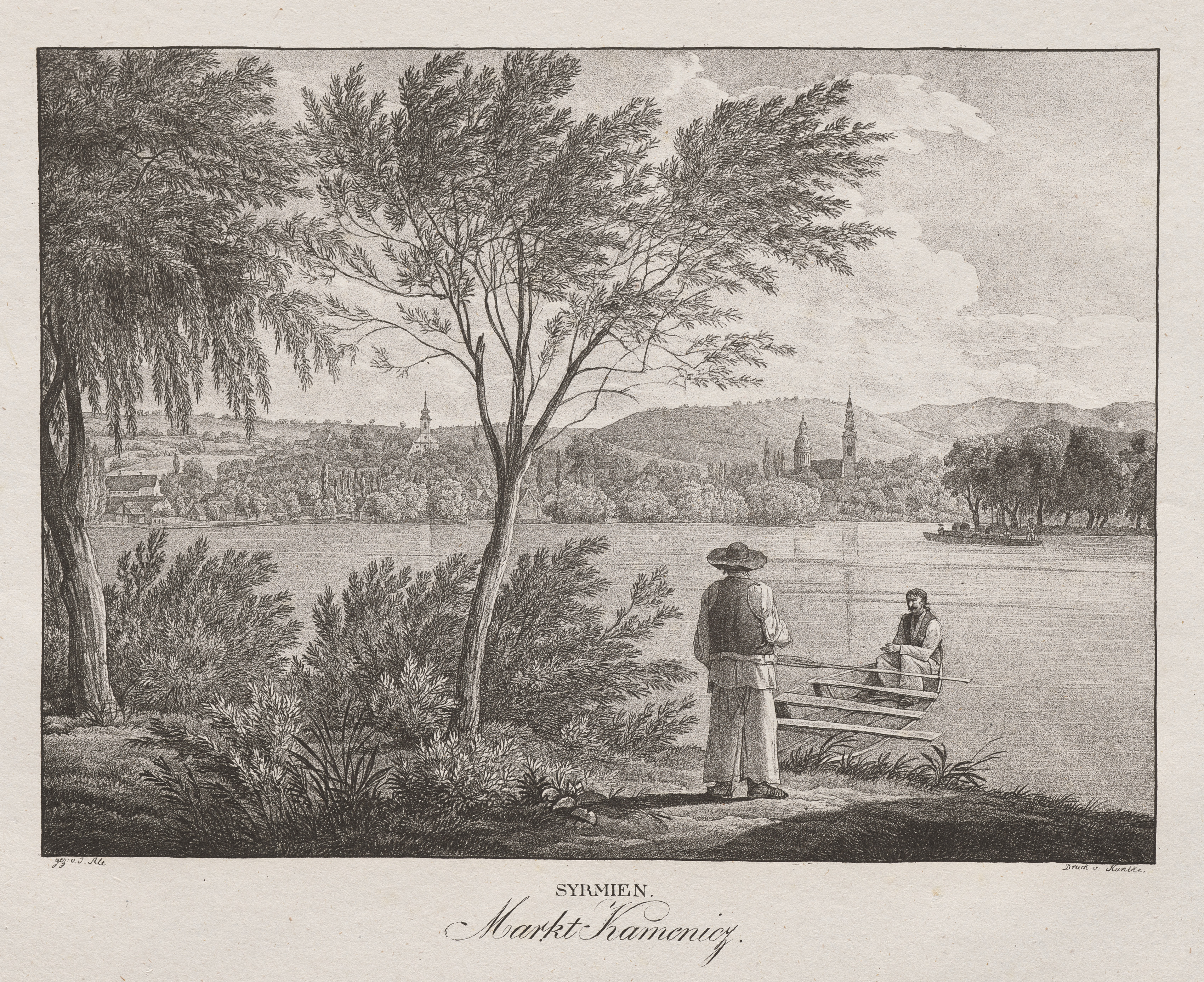 Black and white landscape drawing. A river spans horizontally across the drawing with a boat on the right side. A man sits in a wooden boat. A man stands on shore looking out at the river with his back to the viewer. A tree stands on the shore to the left. A town and a church are across the river on the left, and there are hills on the right. A boat floats on the water on the right. A cloudy sky hangs over the scene. A tree-covered shoreline borders the right side of the water. Bushes and grass grow on the shore in the foreground. A caption at the bottom reads "SYRMIEN. Markt Kamenicz".