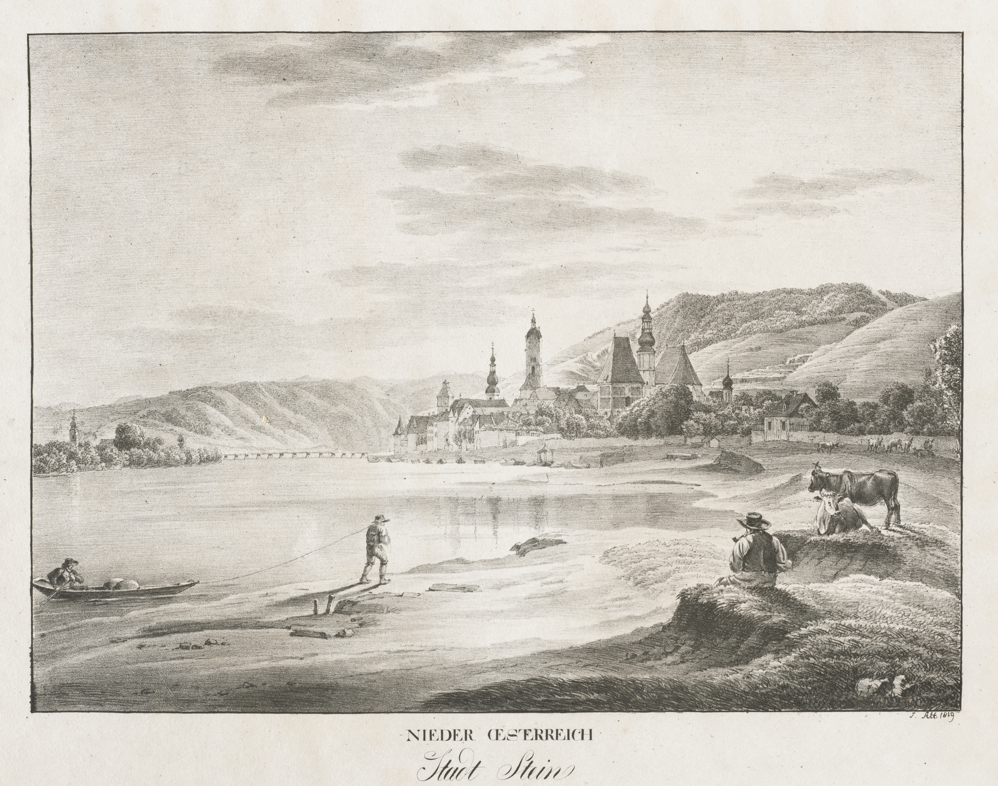 Black and white landscape drawing of a river with people and a boat on the left side, and a person and two oxen on the right side. A town sits on the opposite bank with several buildings with dark roofs and several towers. Mountains rise behind the town on either side. The sky is cloudy. The drawing sits on a white background with writing underneath it. At the top, the sky takes up approximately one third of the image, with clouds scattered throughout. A bridge crosses the river on the left side, with trees on the near bank. Two people are on the near side of the river. A small boat with a person sits on the left side of the river. The town on the far side of the river has several buildings with steep roofs and chimneys. There are several towers of varying heights, some of which appear to be church steeples. The mountains on either side of the town are covered in trees and have a gentle slope. The writing underneath the drawing reads "Nieder Oesterreich" on one line and "Stadt Stein" on the next line.