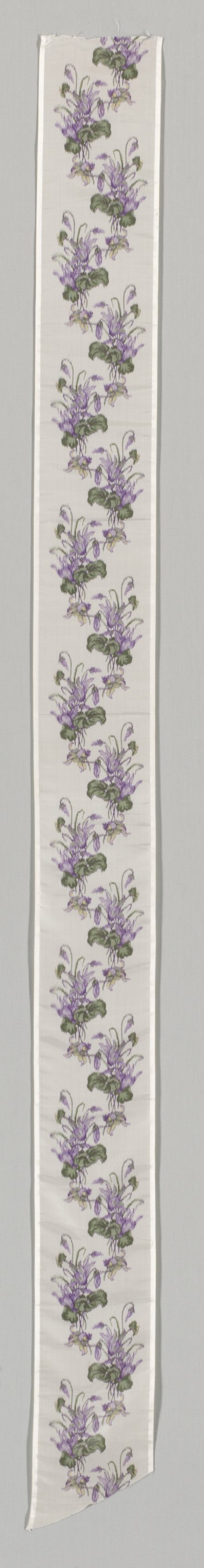 Long, narrow white fabric with a repeating pattern of purple flowers and green leaves. The fabric is vertical, with the top and bottom edges not visible. The fabric's left and right sides are straight and smooth. The pattern consists of clusters of purple flowers with green leaves. The clusters are evenly spaced and repeat down the length of the fabric. The background behind the fabric is gray. Title: Ribbon Artist: Not specified.