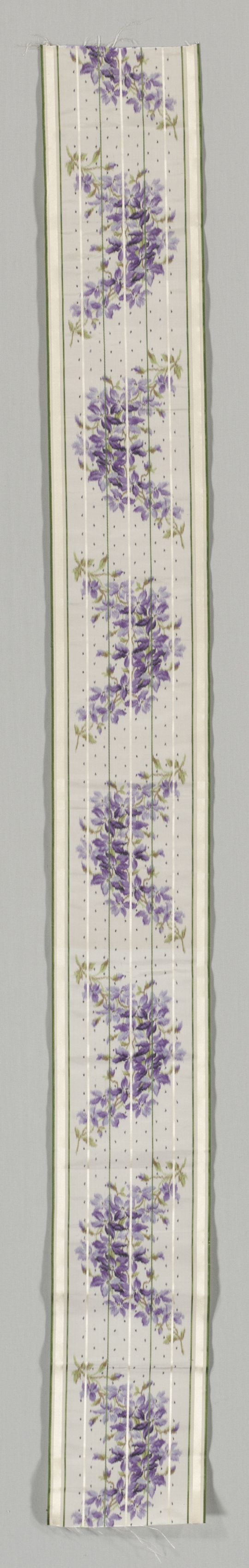 Long, narrow, vertical rectangular piece of fabric with purple flowers and green leaves on a white background. The fabric has thin, parallel, vertical lines running along its length. There are two thin, pale green borders on either side. The fabric appears to be folded in half lengthwise. Purple flowers are clustered in a repeating pattern down center. Green leaves are scattered among flowers. Background behind fabric is gray.