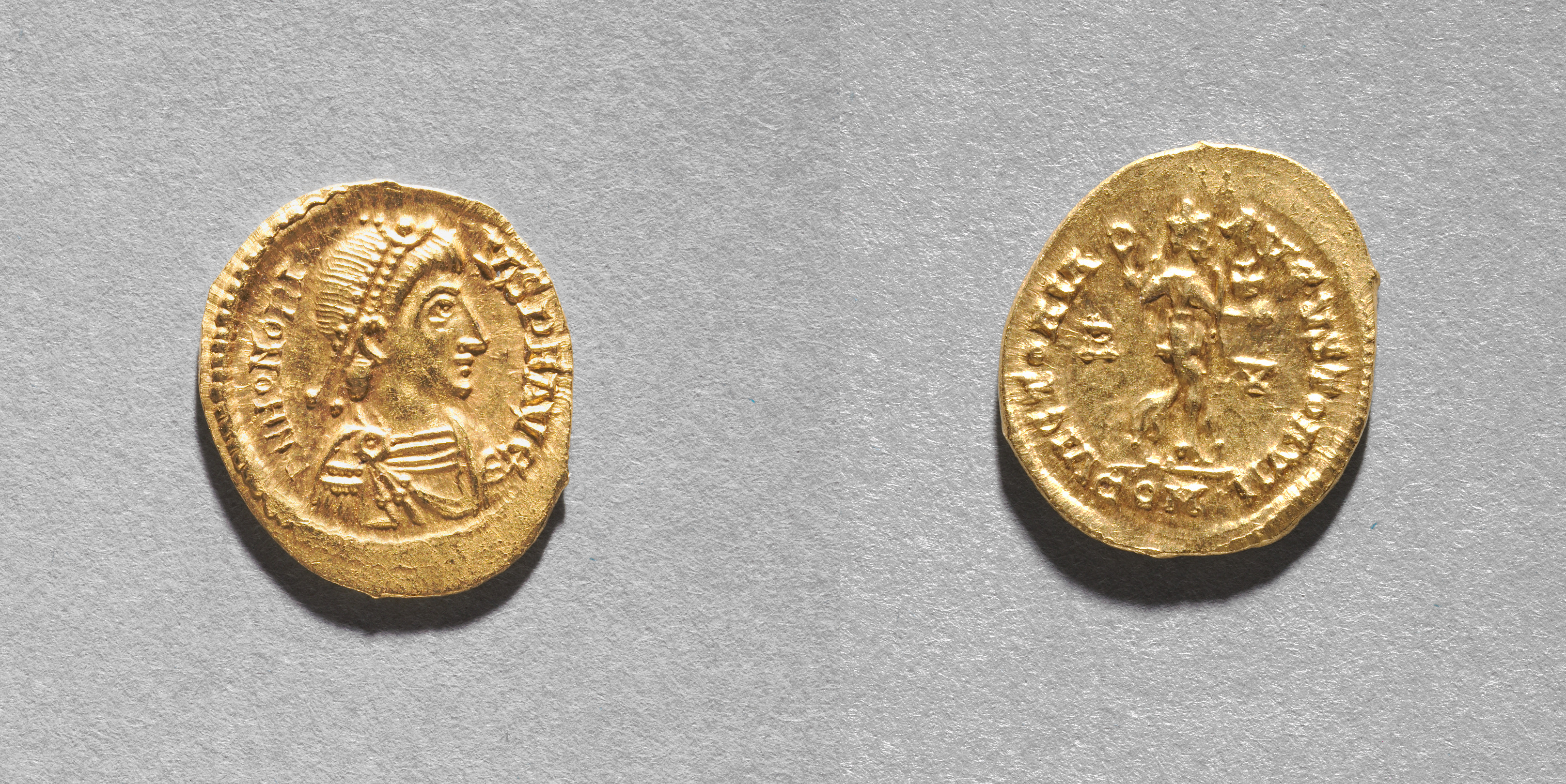 Solidus of Arkadios: Gold coin with a profile view of a man wearing a helmet on the left side and an image of a standing figure on the right side. The coin's surface appears textured. The coin has a rough edge. The background is gray.