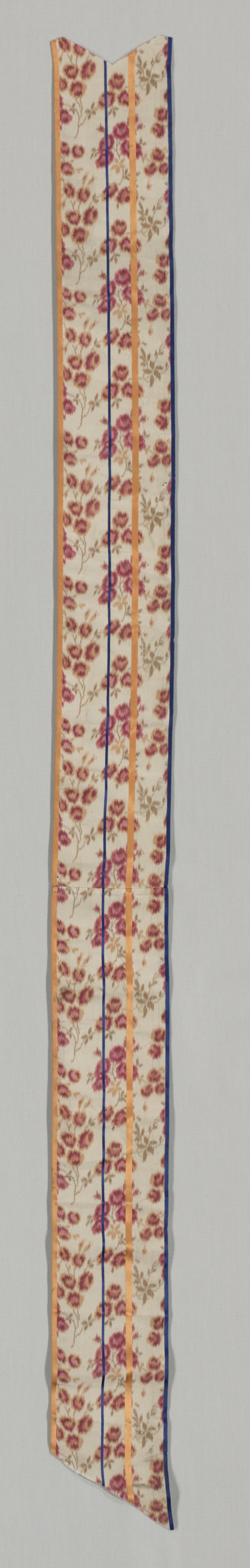 Long, narrow, vertical fabric strip with top and bottom edges curving outward. The fabric has a white background with repeating pattern of small red flowers and green stems. Two thin yellow stripes run vertically down the fabric, one on each side. Two thin blue stripes run vertically down the fabric, one on each side of the yellow stripes, on the edges. The fabric by the bottom right edge appears to be frayed and hangs in a rippling fold. The background behind the fabric is light gray. The title of the artwork is "Ribbon" by an unidentified artist.