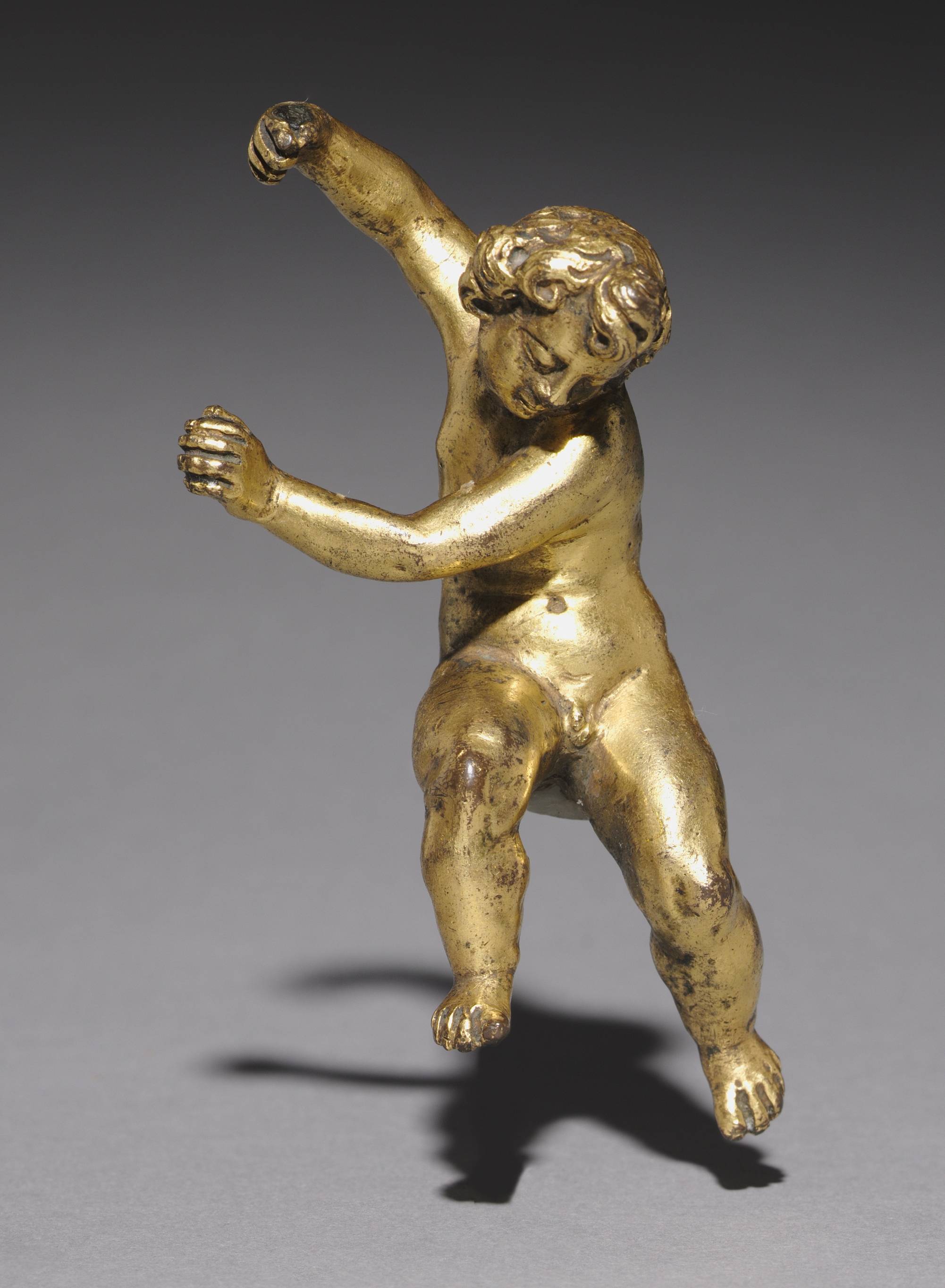 Golden statue of a nude child with curly hair, titled "Putto". The child's right arm is raised above their head and their left arm is extended to their side. Their left leg is slightly bent and their right leg is straight, with their weight on their right leg. The child has a small nose and mouth and appears to be looking downward. The statue has a dark patina with some areas of wear and tear, and it casts a shadow on a gray surface. The background is a gradient from dark gray at the top to light gray at the bottom.