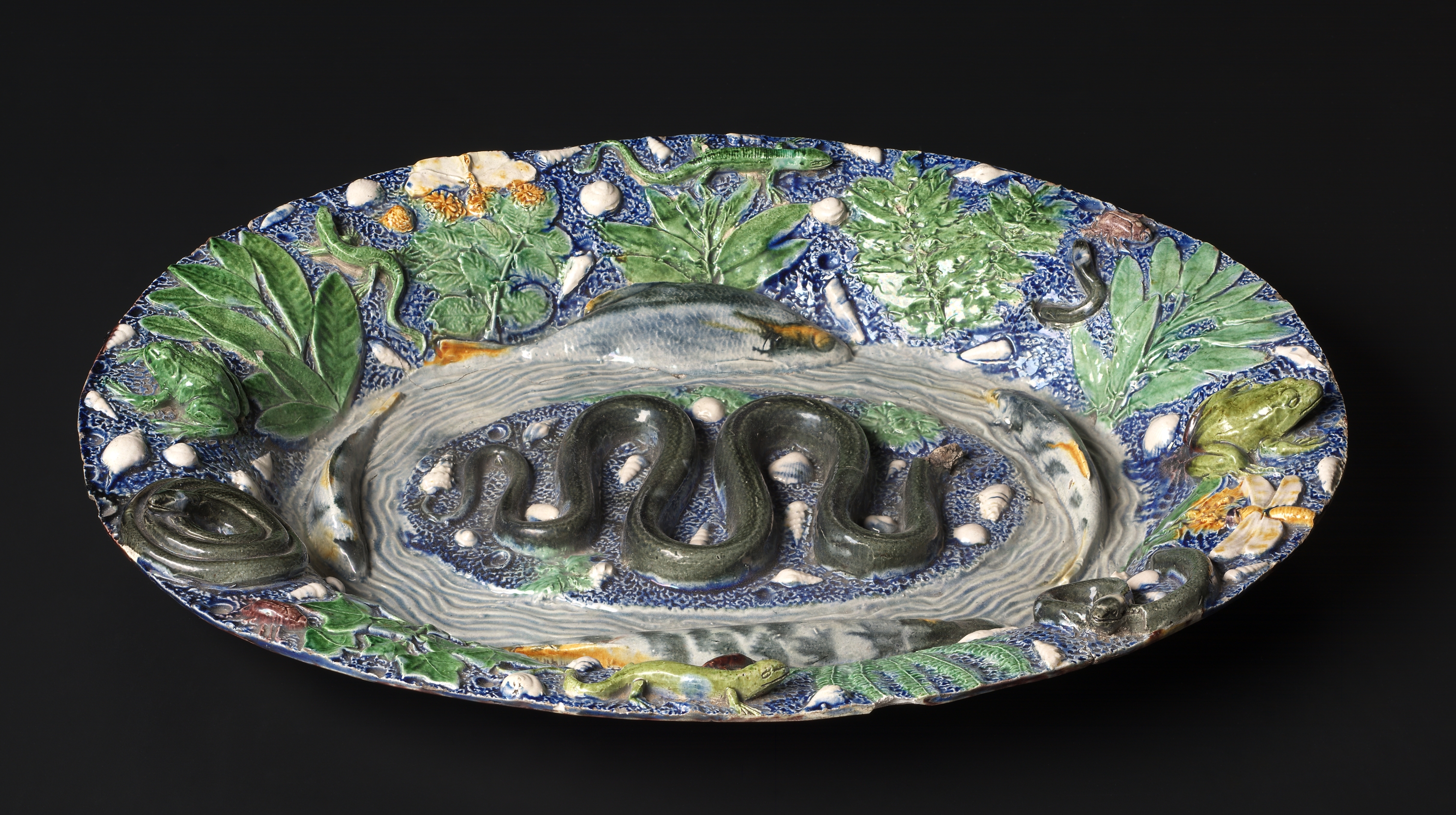 Rustic Platter by Bernard Palissy. The image shows an oval ceramic platter. The platter has a blue background with a textured pattern. The rim of the platter features green leaves and shells. Inside the platter, there are several raised objects including eels, frogs, and lizards. The eels are grey and curved. The frogs and lizards are green. The platter's colors include shades of blue, green, and white. The background behind the platter is black.