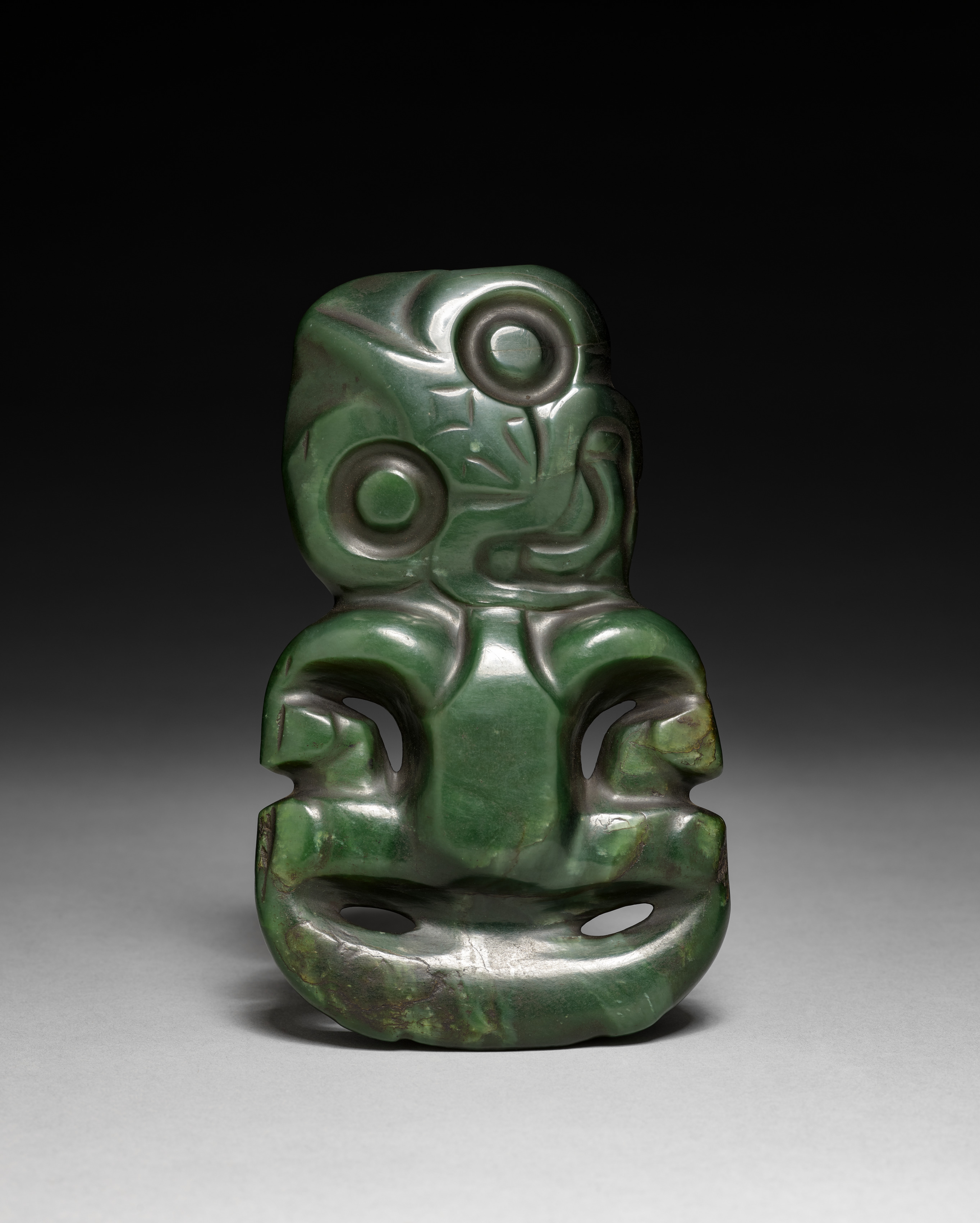 Green jade carving. Upright. Roughly humanoid form. Top half resembles a face. Top rounded. Two small circles for eyes. Nose extends down from between eyes. Carved curved lines on sides of face. Bottom half rounded and open at bottom. Two curved protrusions on either side. A Hei-tiki by unknown artist.