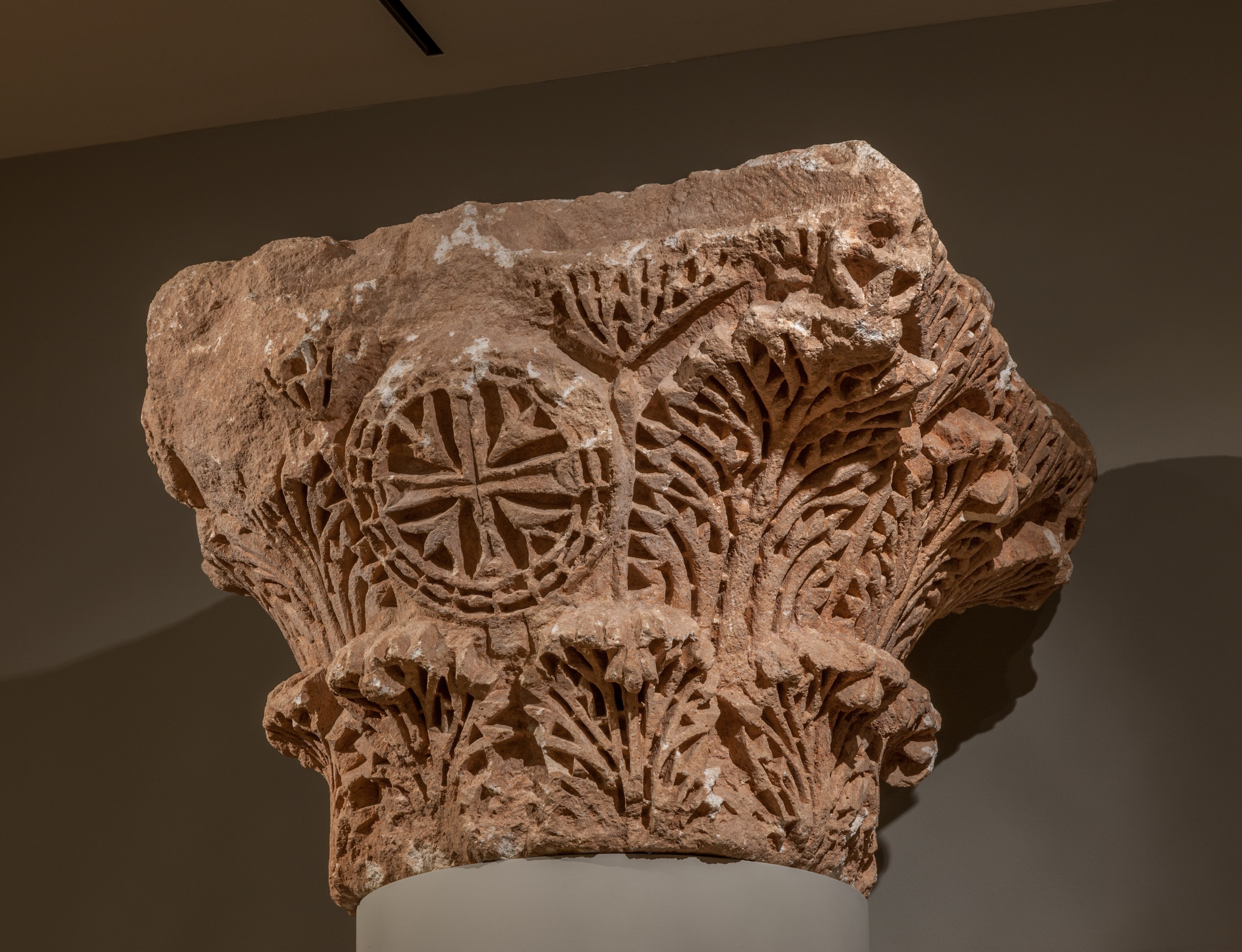 The image depicts a capital with acanthus leaves and crosses. The capital is made of reddish-brown stone and features a square top with rounded edges. It has a carved design of acanthus leaves and crosses. The capital appears to be old and weathered, with some areas showing signs of wear and tear. It is displayed on a white pedestal against a dark background. The capital's surface is textured and rough, with intricate carvings of acanthus leaves and crosses. The carvings are deep and detailed, suggesting a high level of craftsmanship. The overall appearance of the capital suggests that it is an ancient artifact, possibly from a historical building or monument. The image provides a clear view of the capital's design and details, allowing for a thorough examination of its features.