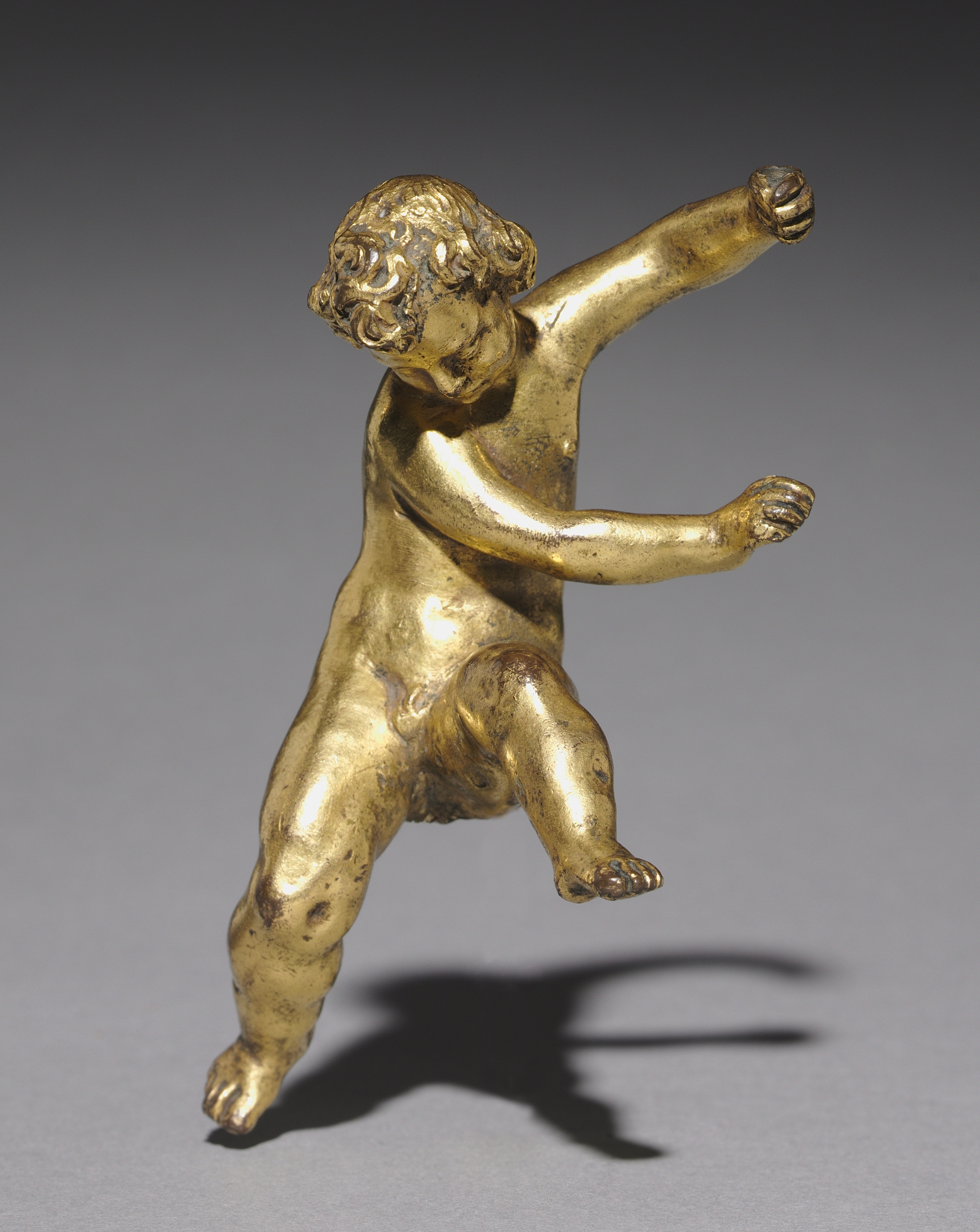 Golden statue of a nude child, titled "Putto", by an unknown artist. The statue depicts a small, naked figure with curly hair, captured in a dynamic pose. The right arm is extended outward and upward, while the left arm is bent at the elbow and positioned in front of the body. The right leg is slightly bent, and the left leg is straight, with the heel lifted off the ground. The statue has a weathered appearance, with visible signs of aging and wear. The background of the image features a gradient that transitions from dark gray at the top to light gray at the bottom. A shadow is cast by the statue onto the surface below.