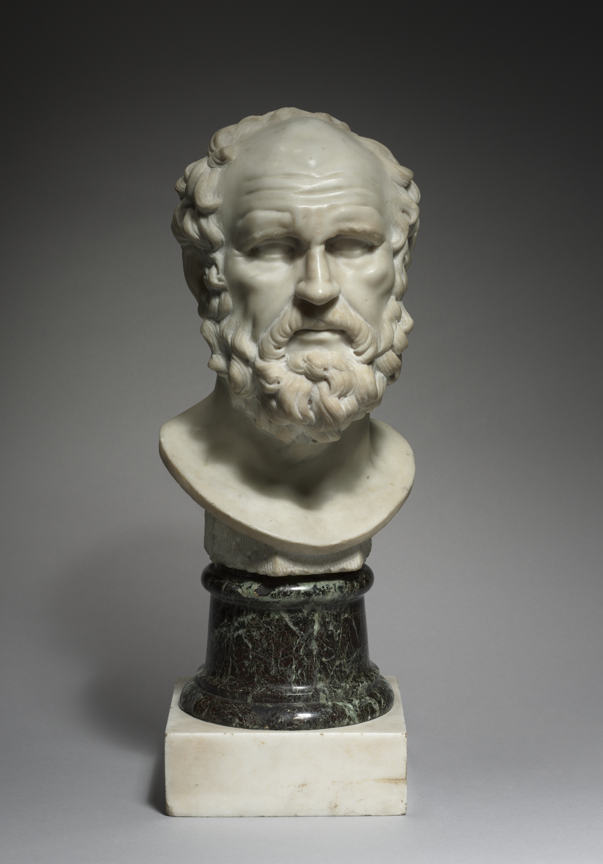 White marble bust of a man with curly hair and beard on a dark green marble and white marble base. The man has a serious expression with furrowed eyebrows, and his hair is receding. He has a thick beard and mustache. The bust is on a two-part base, with a dark green marble cylinder on top of a square white marble block. The background is a gradient from dark gray at the top to light gray at the bottom. The bust is titled "A Philosopher" and was created by Pierre Puget.