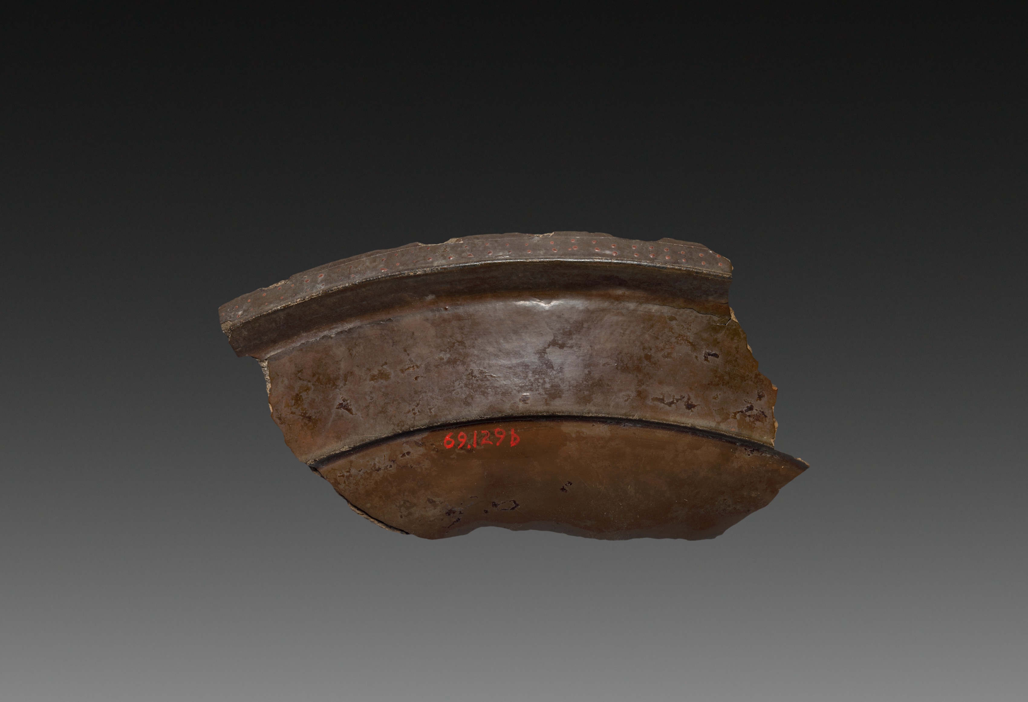 Fragment of a Lacquer Tray by Unknown. The image shows a broken, brown, lacquered tray fragment. The fragment is curved and roughly half of a full tray. The top and bottom edges have a small lip. The material appears to be wood with a smooth, glossy finish. There are visible signs of wear and tear, including scratches and discoloration. The background is a gradient from black at the top to gray at the bottom. Red text on the bottom reads 62.129b.