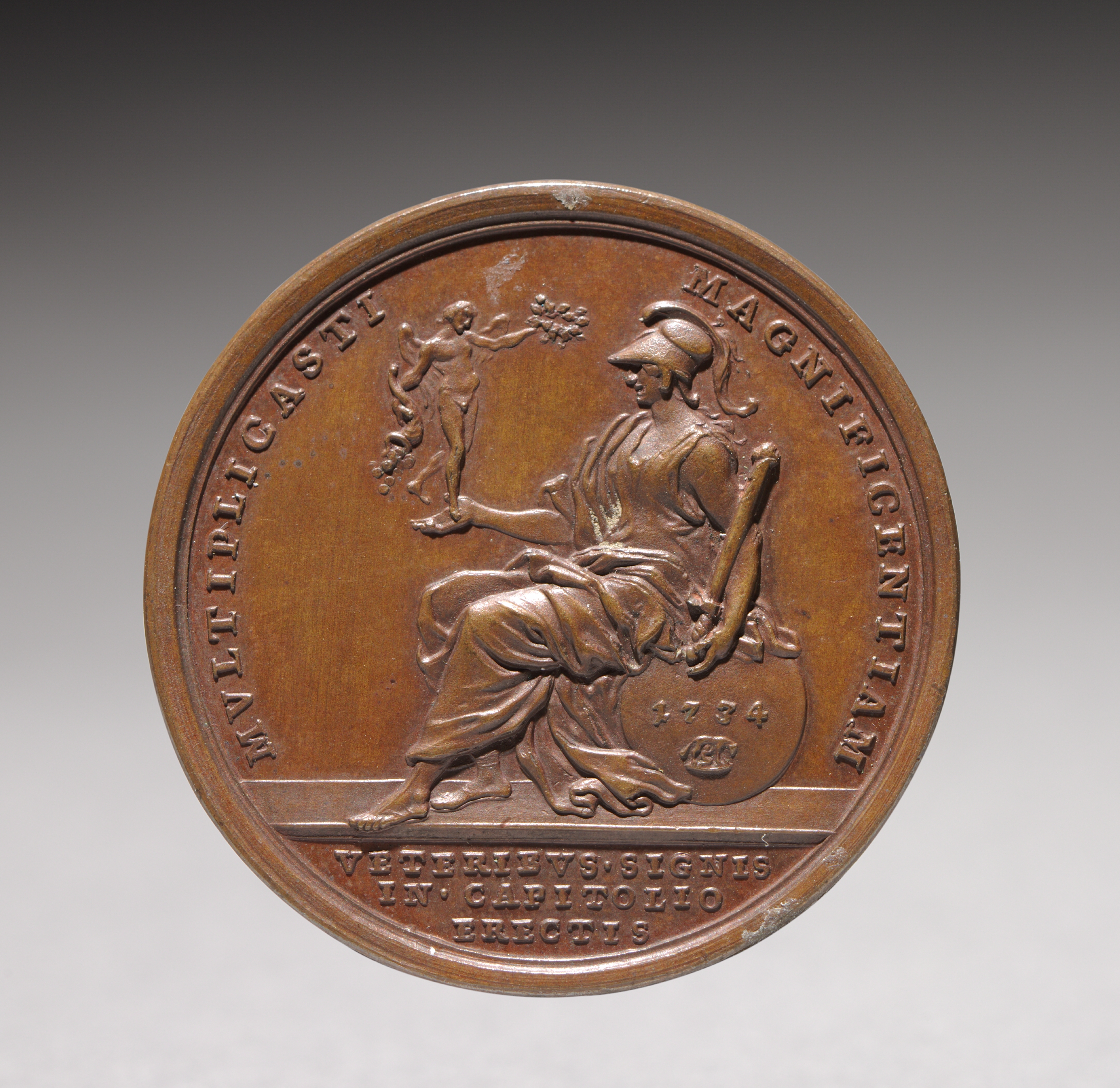 Copper-colored, round medal with raised images and text. A seated woman wears a long dress and holds a shield with the date 1734; she sits on a line with a cherub to her left. The text around the edge reads, from left to right: MULTIPLICES GASILL MAGNTBICENITI The bottom text reads: VETERIEVSSIGNIS IN CAPITOLIO ERECTIS.