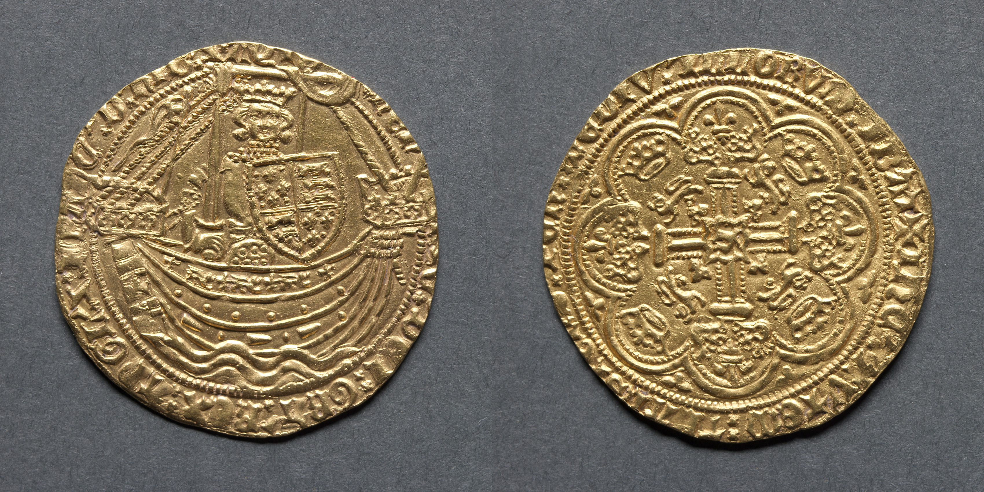 Noble: Edward III Standing in Ship with Shield of Arms (obverse); Ornamental Cross with Lis Terminals (reverse)