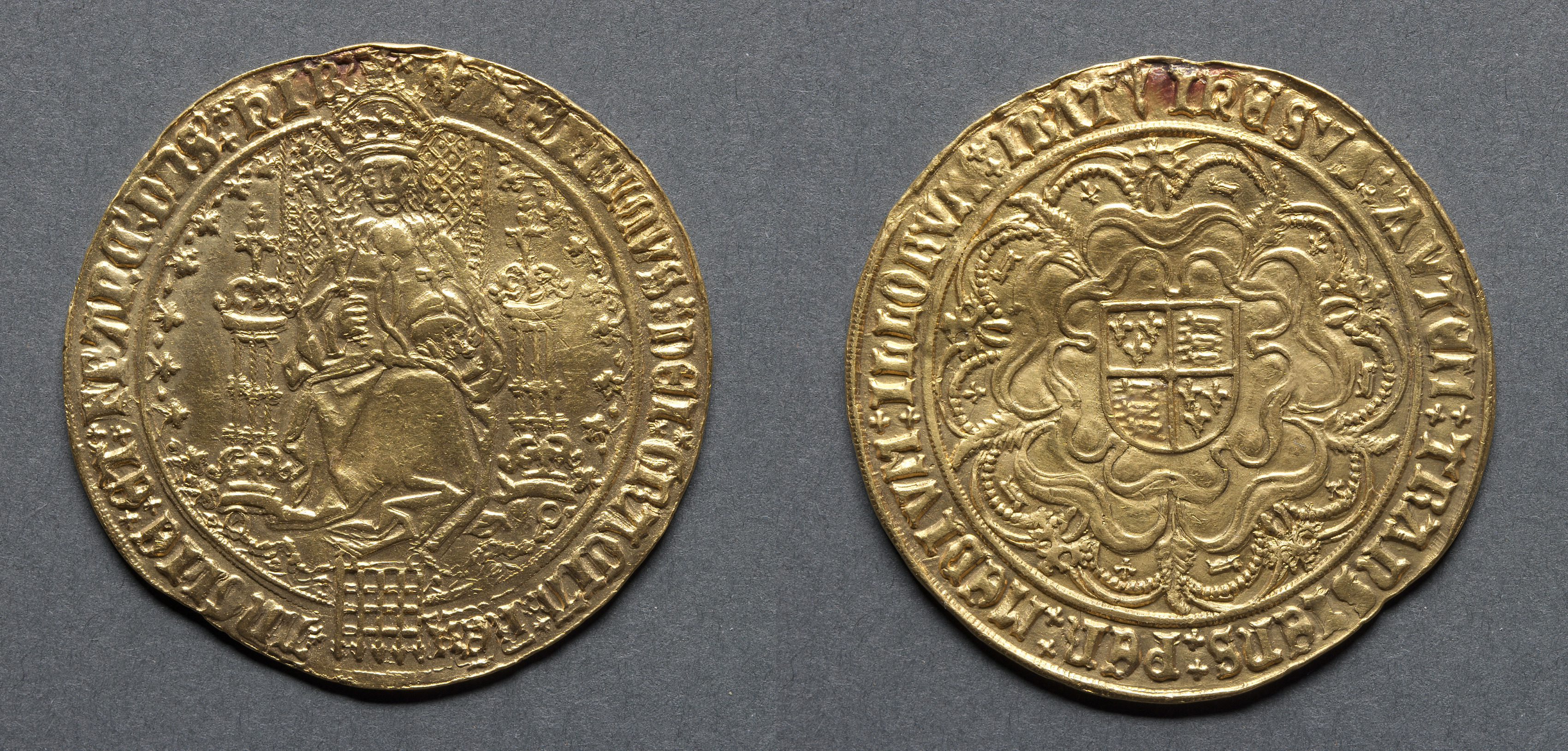 Noble: Edward III Standing in Ship with Shield of Arms (obverse); Ornamental Cross with Lis Terminals (reverse)