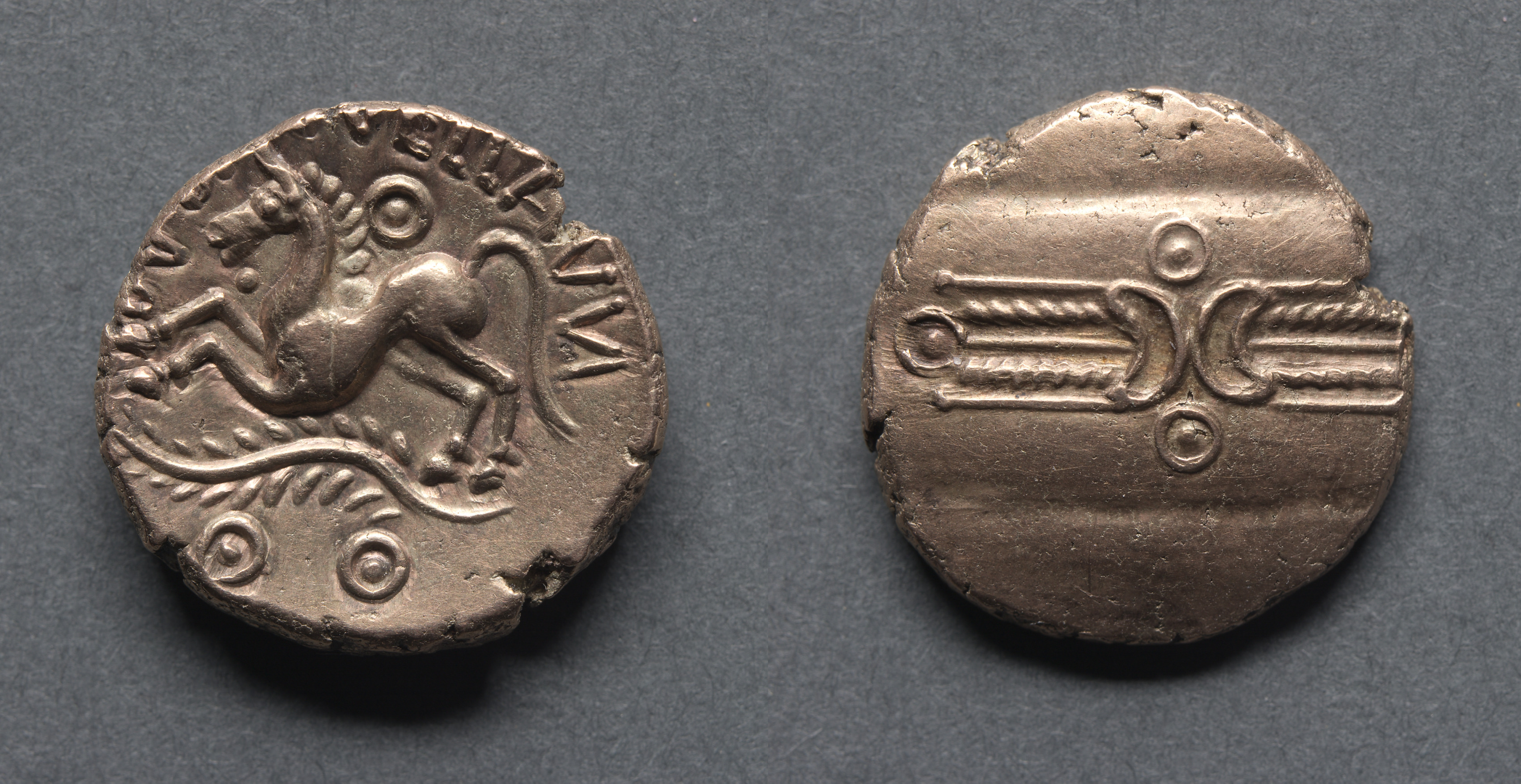 Dubnovellaunos Stater: Wreath and Crescents (obverse); Horse with Branch (reverse)