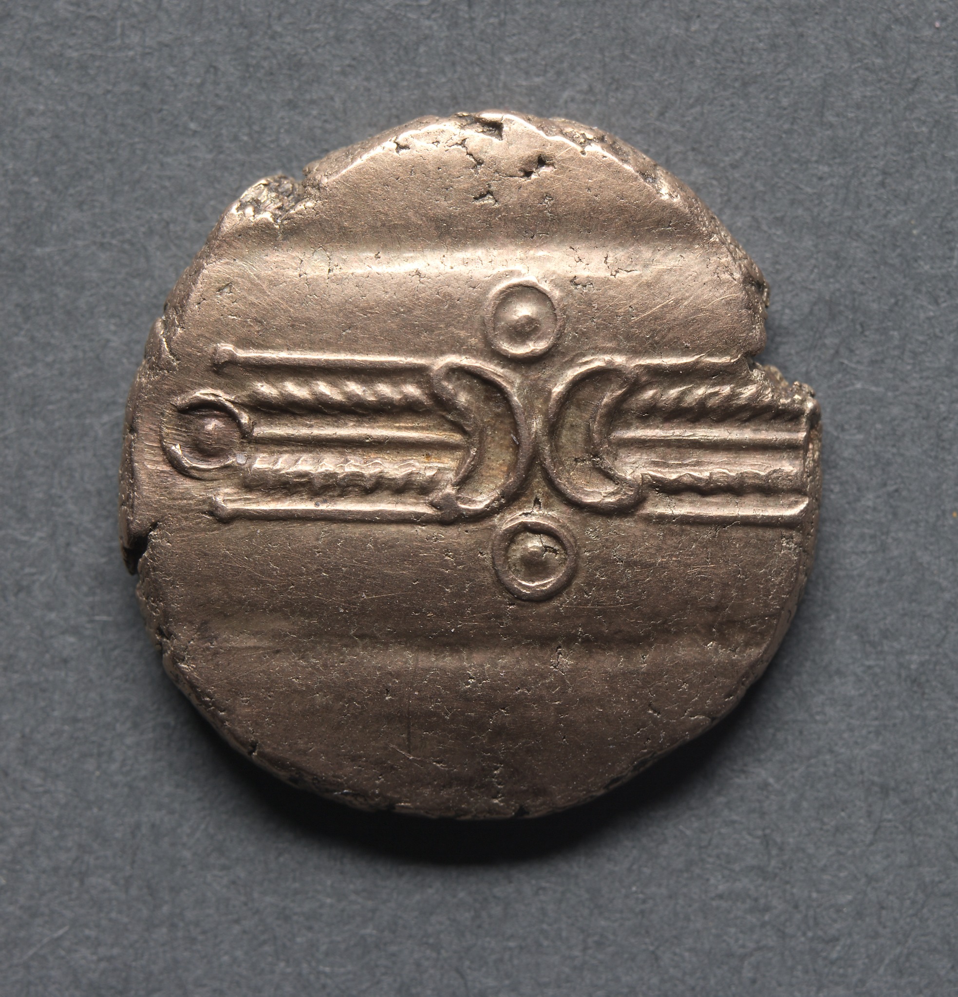 Silver stater coin, circular, slightly irregular shape. Two horizontal lines on top and bottom edges. Decorative design in the center: two crescent shapes back to back with a dot above and below. The crescents connected by two horizontal lines with rope-like texture on outer edges. The coin has a worn appearance, with visible signs of aging, scratches, and chipped edges. Gray background.