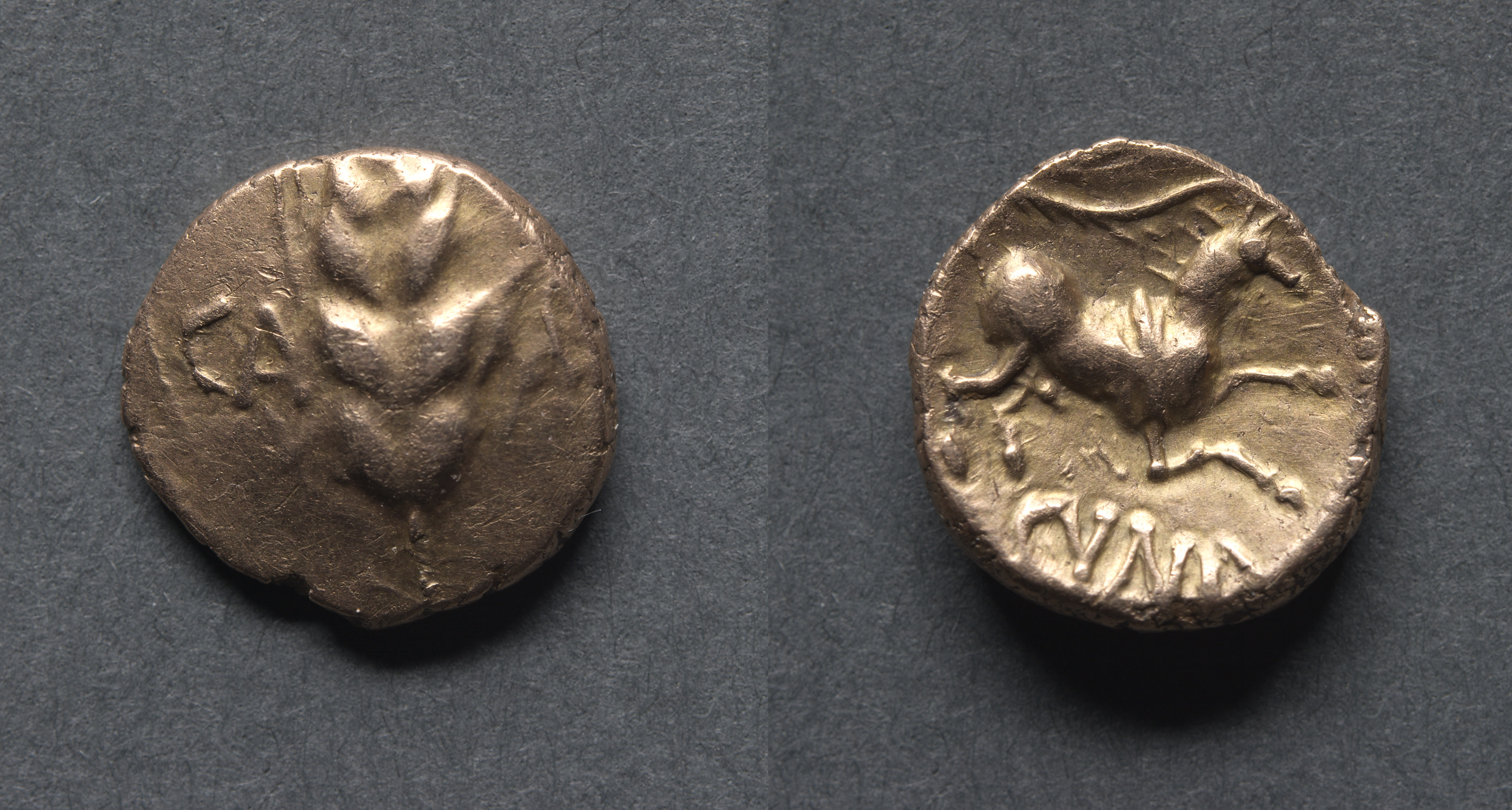 Cunobeline Quarter Stater: Corn (obverse); Horse and Branch (reverse)
