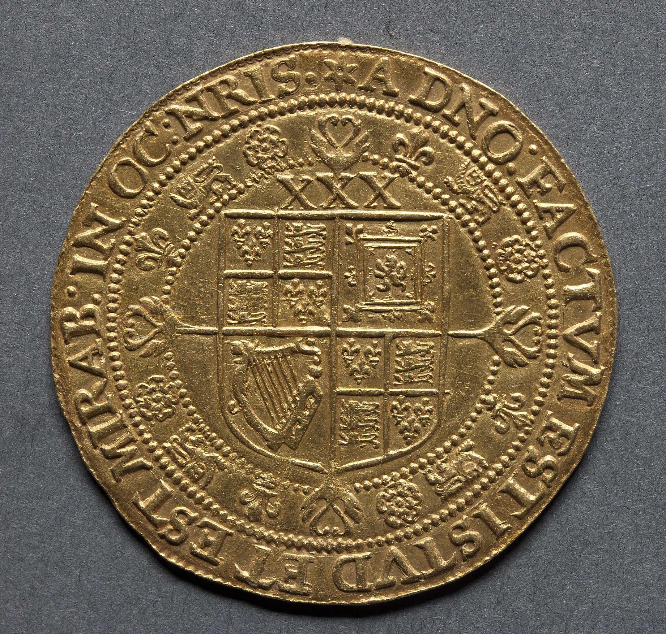 Gold coin with a shield in the center that is divided into four sections. The shield has a smaller shield with a harp in the bottom left. The coin has a beaded border around the shield and text around the edge. The text appears to be Latin. The coin is on a gray background.