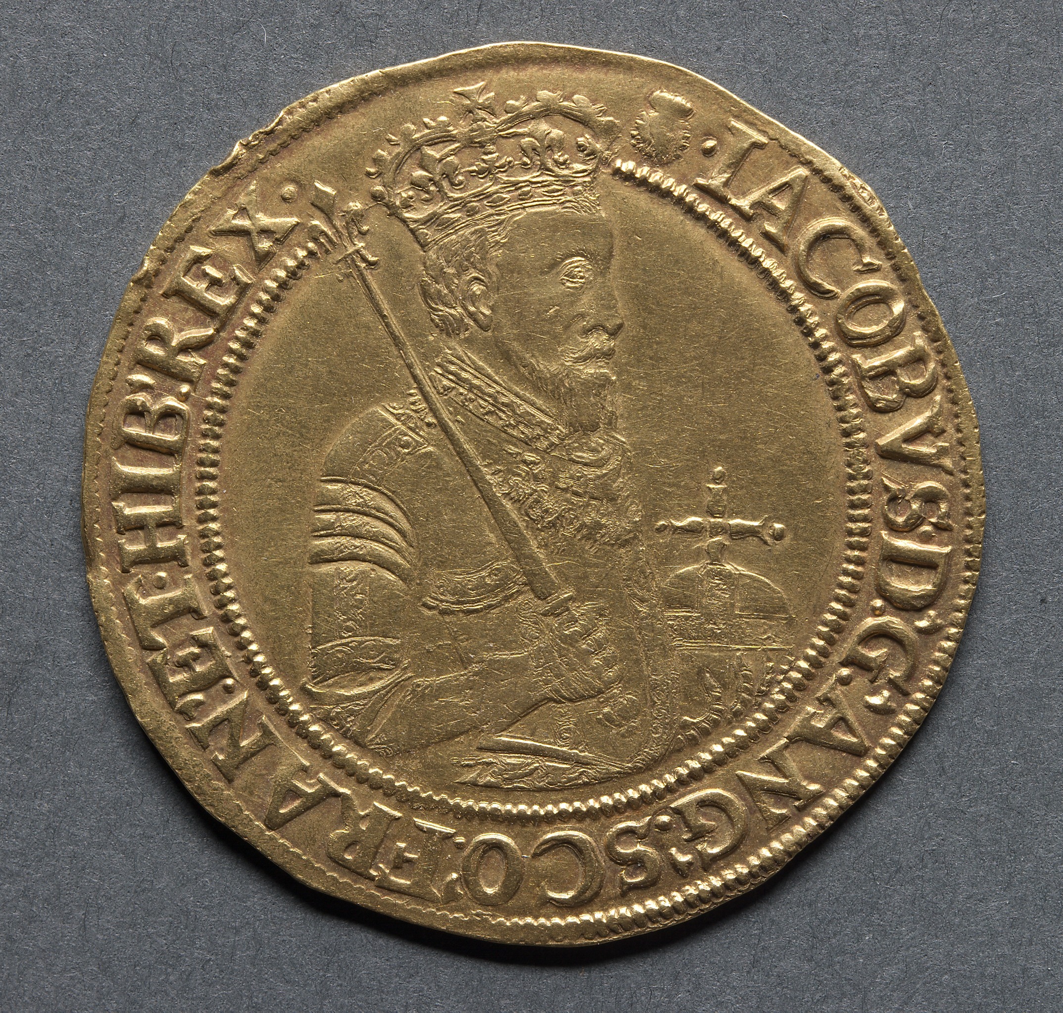 Gold coin with a profile portrait of a man with a beard facing right. He wears a crown and holds a scepter in his right hand. His left arm is covered in armor. A circular border of small beads encircles the man. The words "IACOBVS REX" are on the top right and "HIBER NVM" on the left, with additional text along the bottom edge.