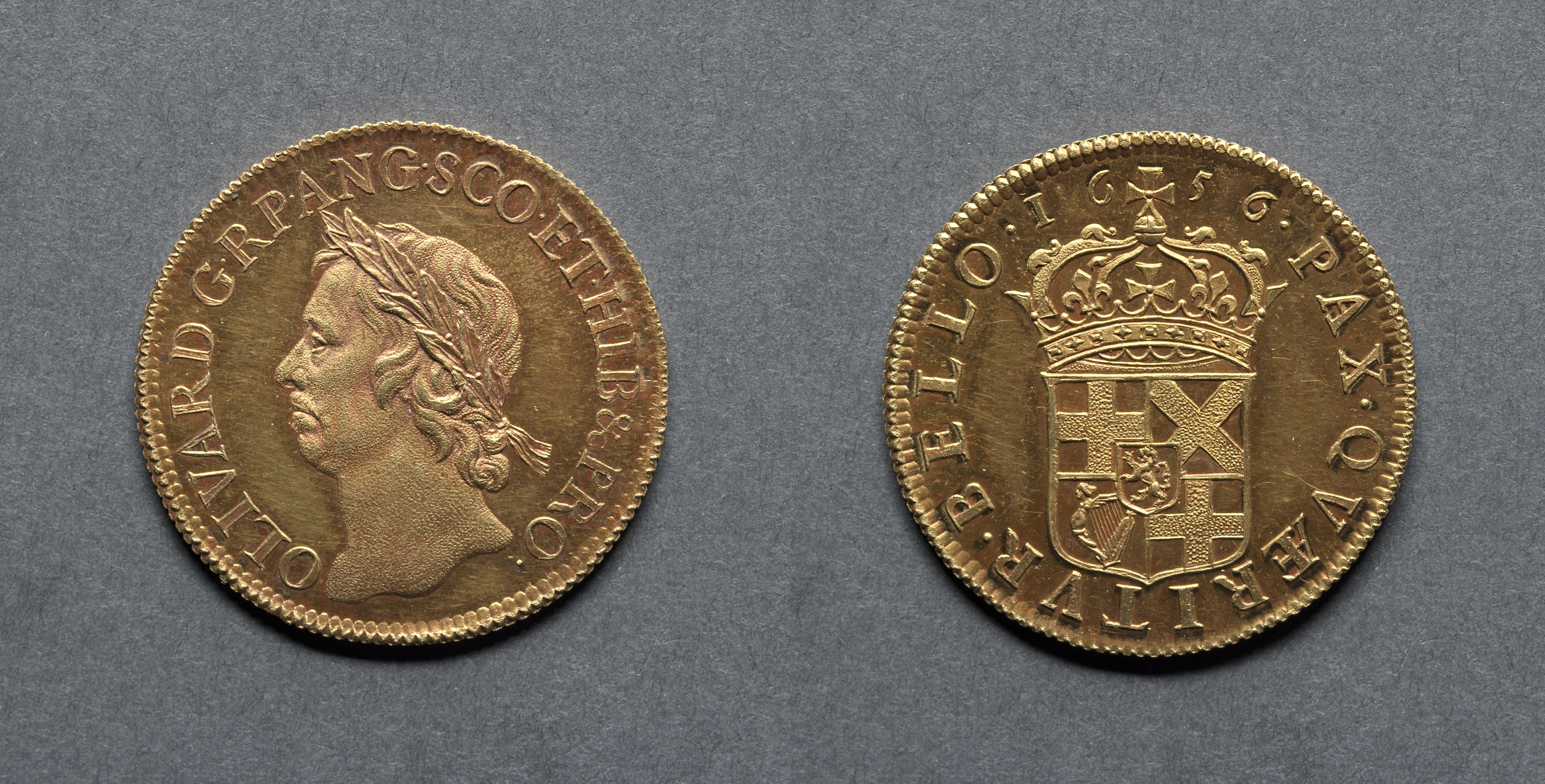 Two gold coins. The coin on the left has a side profile of a man with short curly hair wearing a laurel wreath. The words "OLIVERUS CROMWEL LORD PROTECTOR" are written around the edge. The coin on the right has a shield with a crown on top. The shield has multiple sections and appears to have a lion and a unicorn on either side. The words "HEBET O FELICEM BELL IGNAE G PAX QVAERIT" are written around the edge. Both coins have a decorative edge with small bumps. The background is gray.