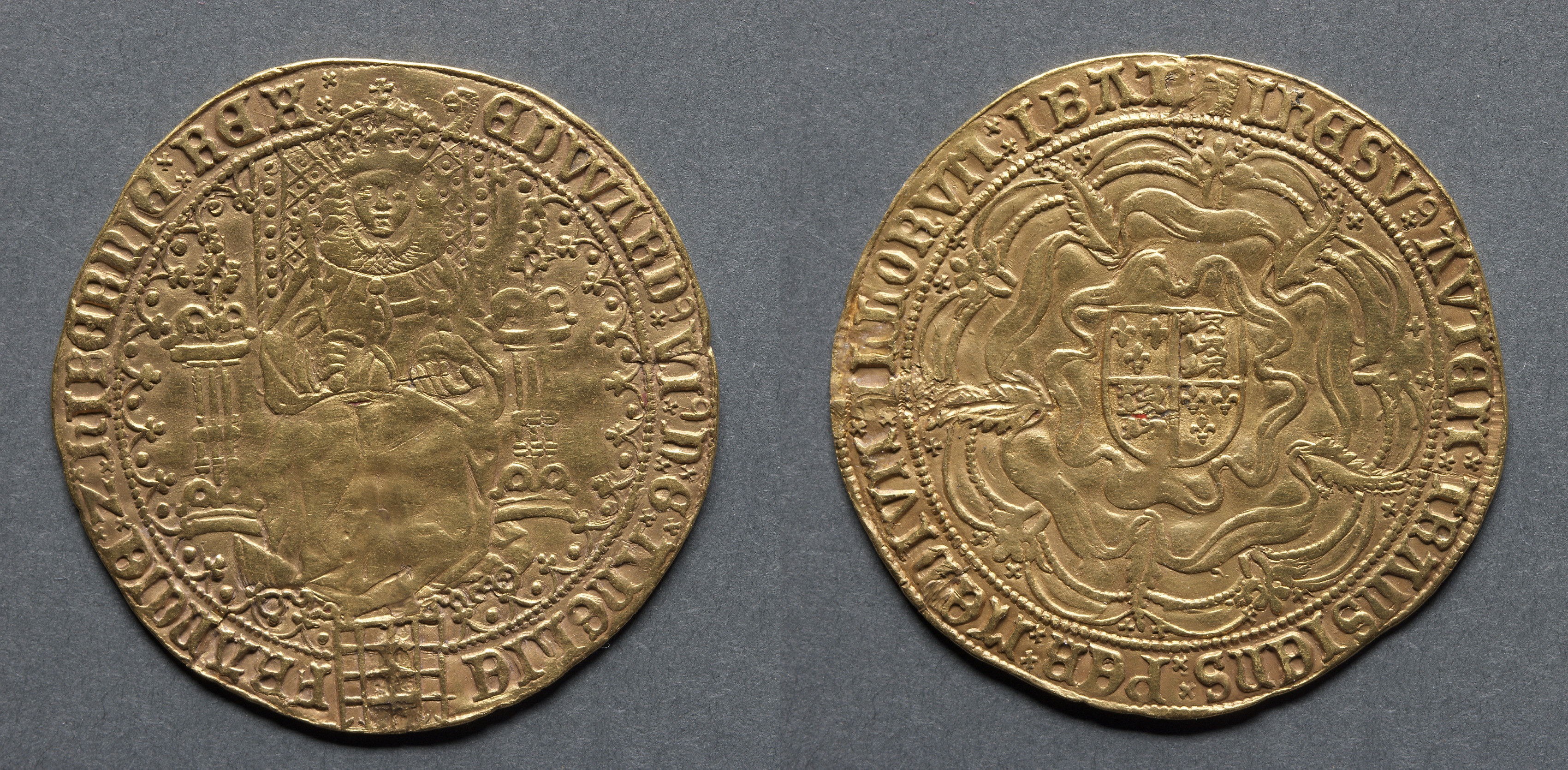 Ryal: Edward IV in Ship with a Shield of Arms and Rose (obverse); Sun with Fleurs (reverse)