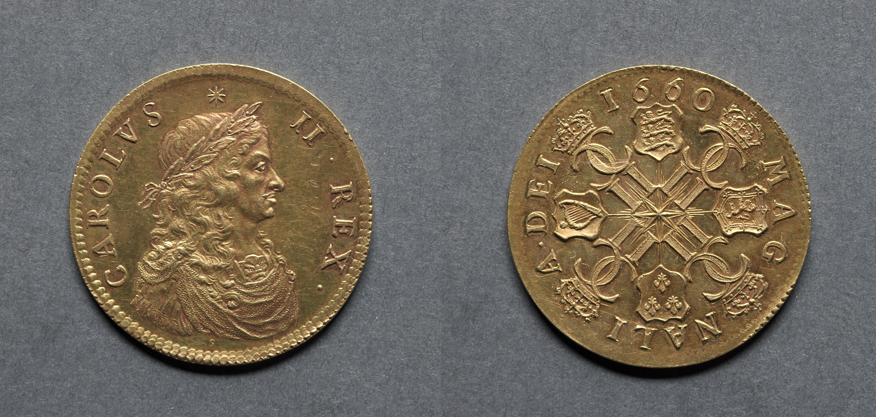 Two gold coins on a gray background. The coin on the left has a profile of a man with long wavy hair and a laurel wreath on his head. The words "CAROLVS II REX" are written in a semicircle around the top half of the coin. The coin on the right has a cross in the center with four shields, one at each end. The cross has a star in the center. There are crowns at the top of the cross and at the top of each shield. The words "A DEI GRATIA 1660 MAG BRAN ET HIB REX" are written around the top half of the coin. The edges of both coins are beaded. The coins are gold in color.