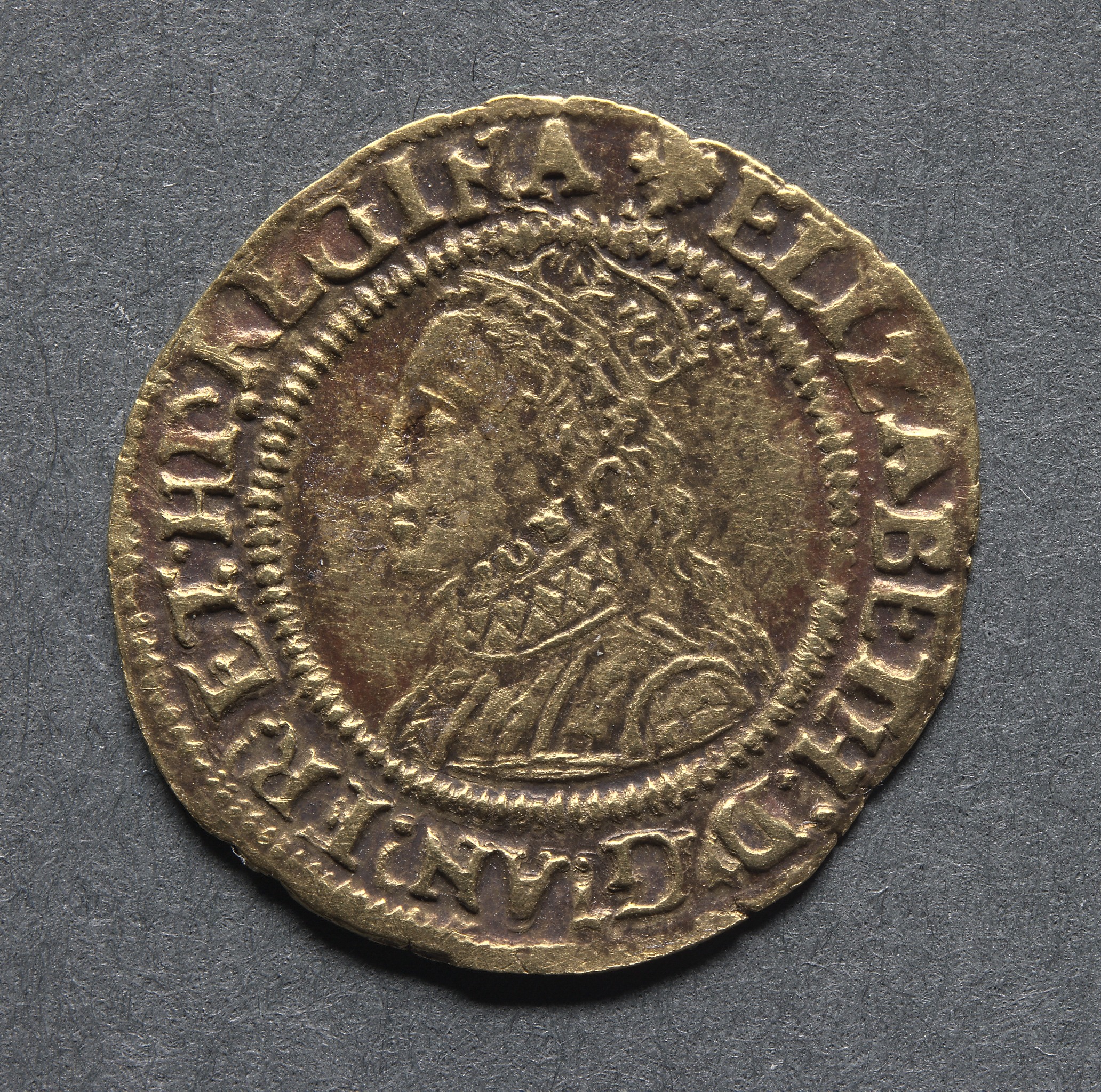 Elizabeth I bust facing left on coin. The coin is circular and made of bronze. The Queen has a ruffled collar and curly hair, a crown on her head. There is text around the edge of the coin. The coin has a rope-like design around the edge and in the center. The coin is on a gray background.