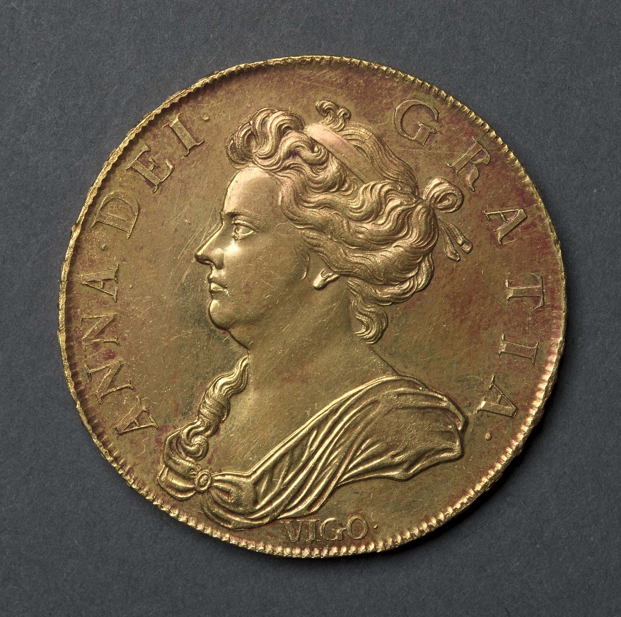 The coin shows a profile view of a woman's head and shoulders. The woman has curly hair pulled back, and the hair on the left side of her head is braided and hanging down. She is wearing a dress with a decorative collar. The words "ANNA DEI GRA TIA" are written around the top half of the coin's circumference. The letters are raised. The coin's surface is gold-colored with some discoloration. The coin has a beaded edge. The bottom center of the coin shows "VIGO". The background behind the coin is dark gray.