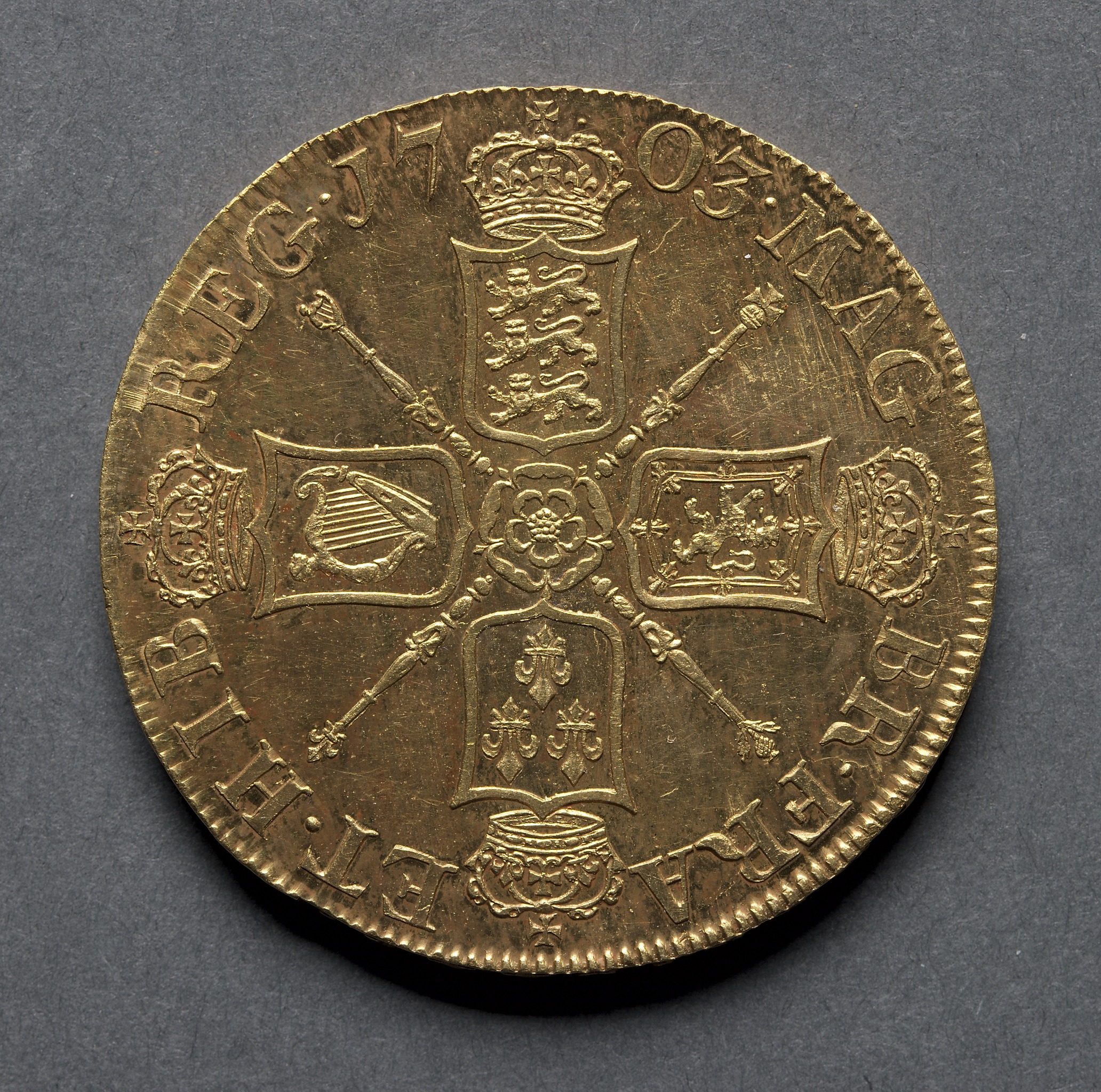 Five Guineas: Crowned Shields of Arms from England, Scotland, France, and Ireland (reverse)