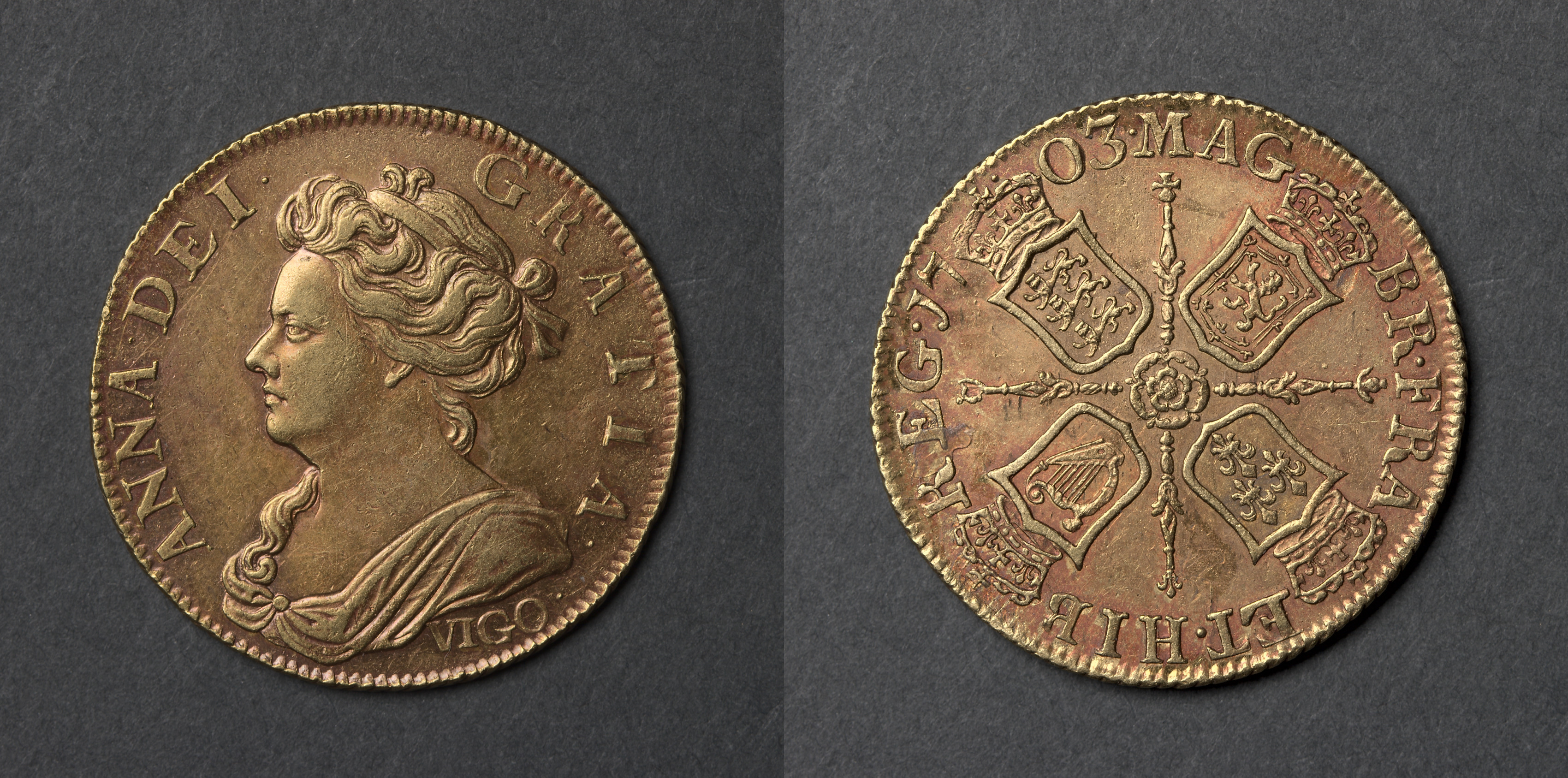 The image shows two sides of a gold coin. The obverse side features a woman's head facing left with curly hair and a crown on top. She is wearing a necklace and a shawl. The words "ANNA DEI GRATIA" are written around the top half of the coin, and "VIGO" is written at the bottom. The reverse side features four shields arranged in a cross shape, with a rose in the center. The top shield features a crown; the top left and bottom right shields feature three fleur-de-lis; the top right and bottom left shields feature a lion. The words "MAG BR FR ET HIB REX" are written around the top half of the coin and "03" is written at the top center. The background is dark gray.
