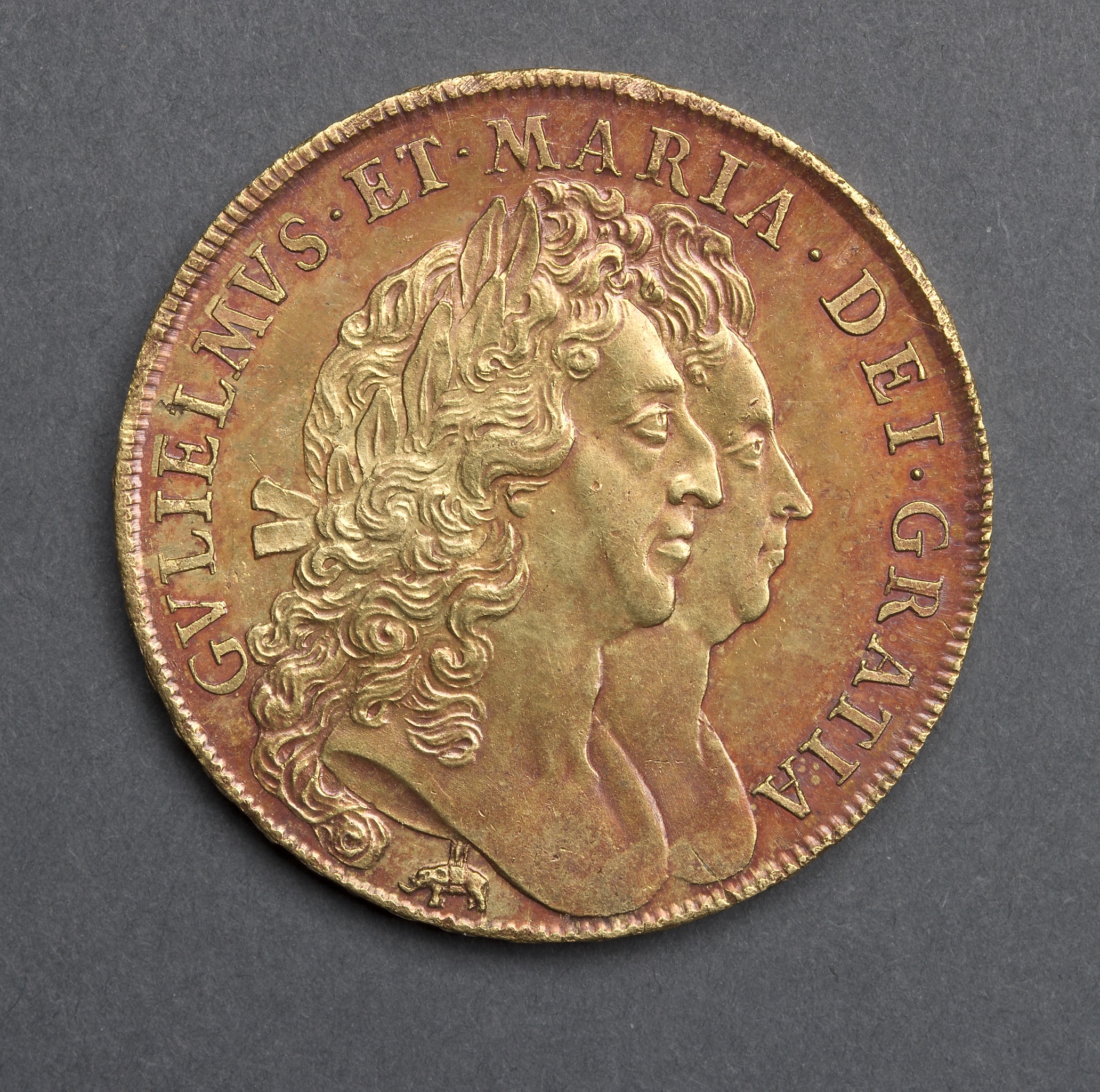 Five Guineas: William III (obverse); Four Shields and Lion of Nassau (reverse)