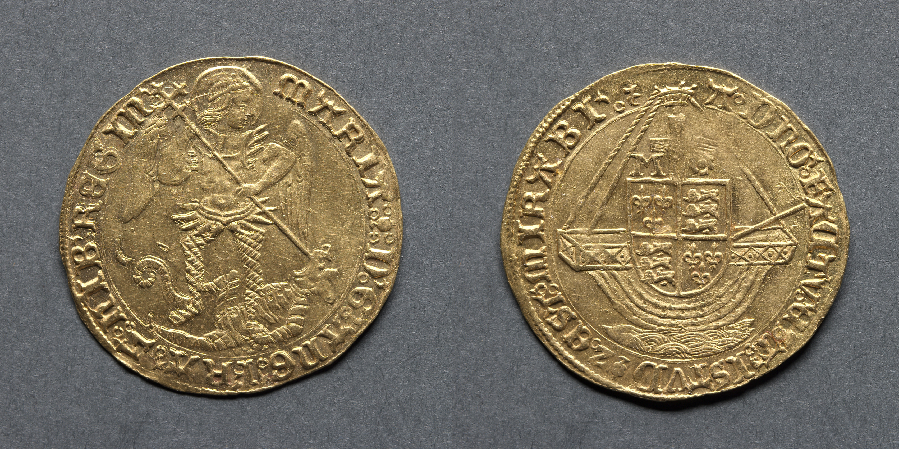 Angel: An Angel Slaying a Dragon (obverse); Ship with Shield of Arms (reverse)