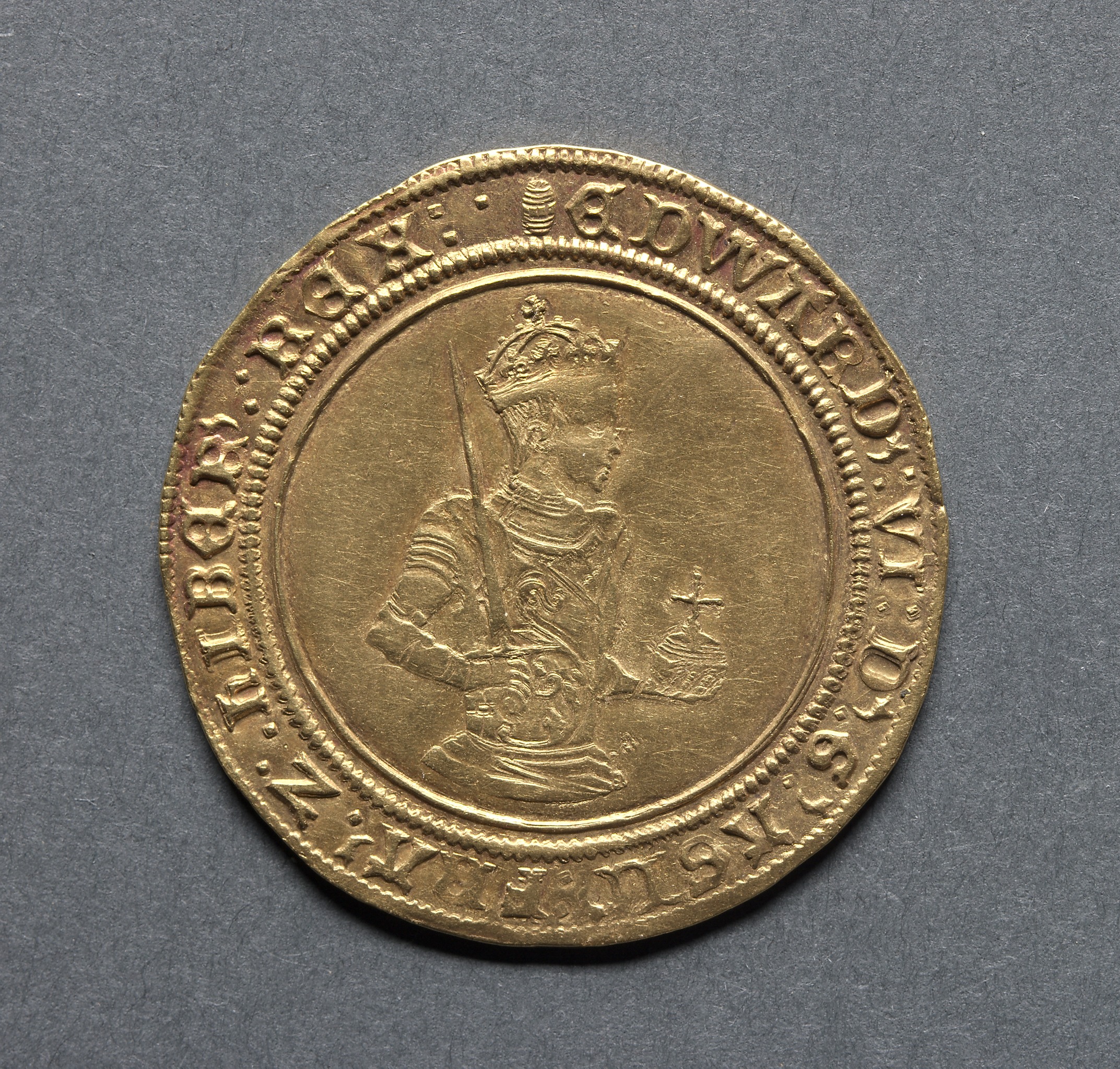 Gold coin with a portrait of a man wearing a crown, holding a sword and an orb. The man is depicted facing right. He wears a robe with puffy sleeves and a collar. The crown has a cross on top. The coin has a beaded border. The words "EDWARD VI REX" are written along the top edge of the coin. Additional text surrounds the bottom edge. The coin rests on a gray background.