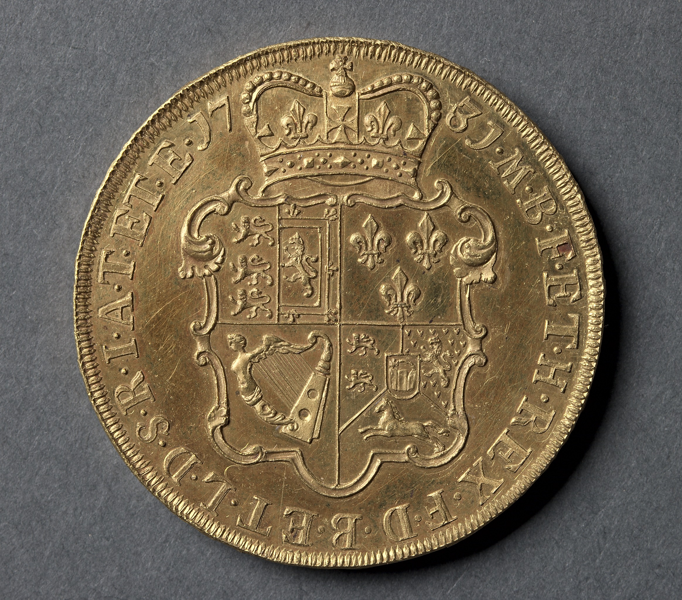 Five Guineas: Crowned Shields of Arms from England, Scotland, France, and Ireland (reverse)