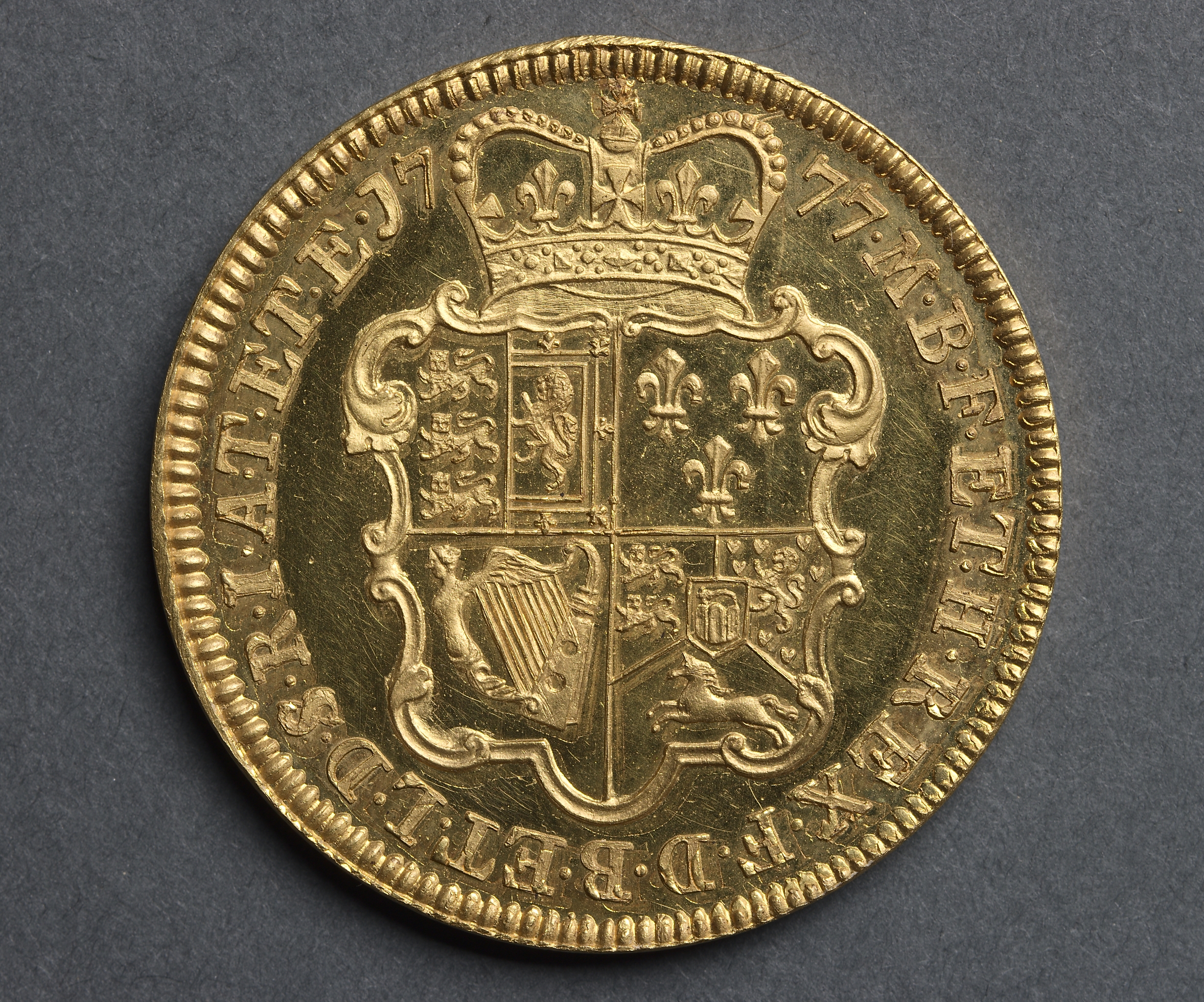 Gold coin with crown at top. Quartered shield of arms under crown. Top left quarter shows three lions. Top right quarter shows three fleur-de-lis. Bottom left quarter shows harp. Bottom right quarter shows lion on a shield with another lion on top. Ornate curlicue flourishes on either side of shield. Text on top edge reads "GEORGIUS REX FIDEI DEFENSOR 1777". Text on bottom edge reads "BRITANIARUM REX FID DEF". Beaded edge. Displayed against dark gray background.