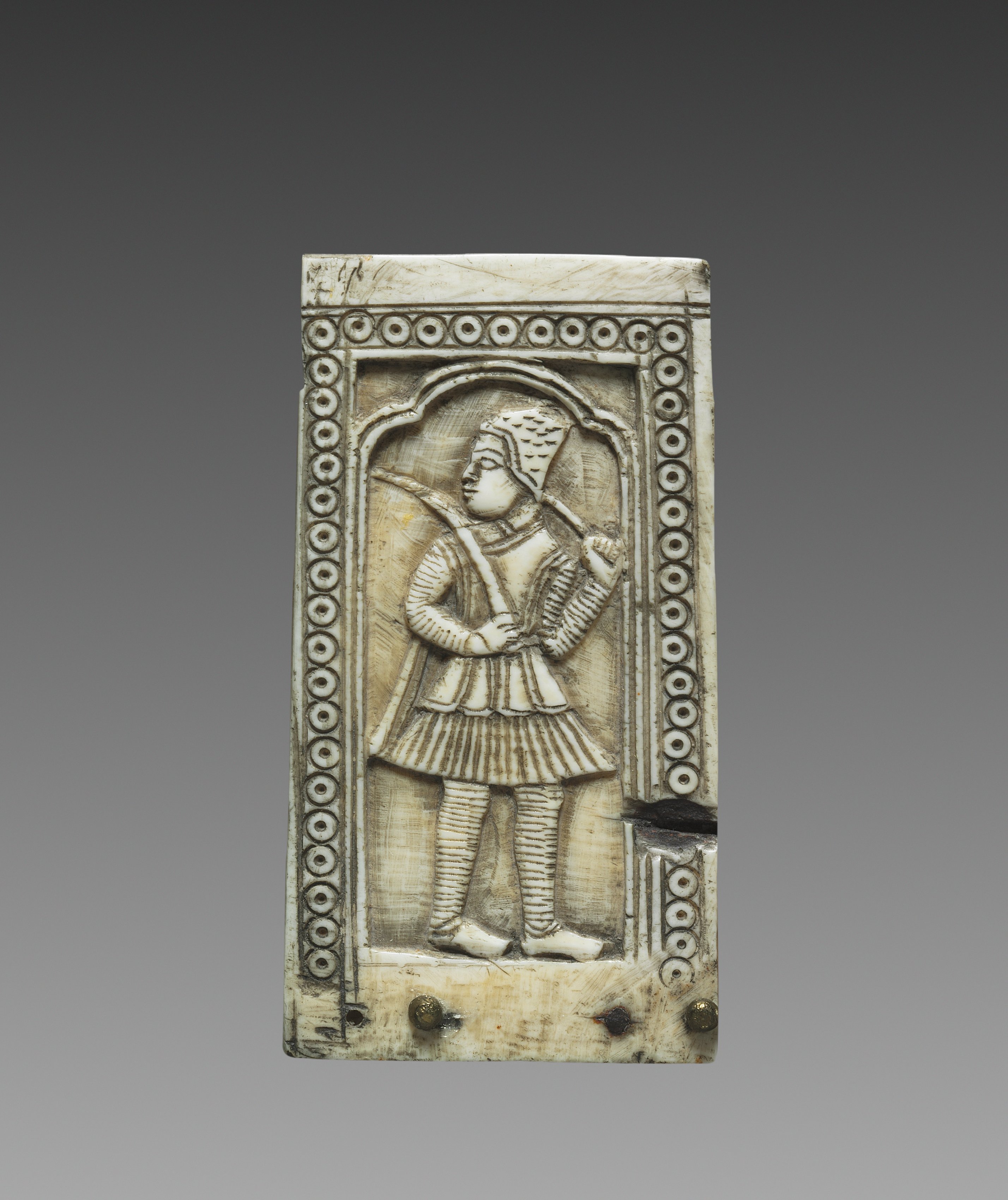 Panel from a Box by an unknown artist: a rectangular, ivory-colored panel with a raised border of small circles; the panel features a carved figure of a man standing within an archway, wearing a helmet and a short tunic with a pleated skirt, and holding a club; the man has a mustache and wears leg coverings; the panel is set against a gray gradient background.