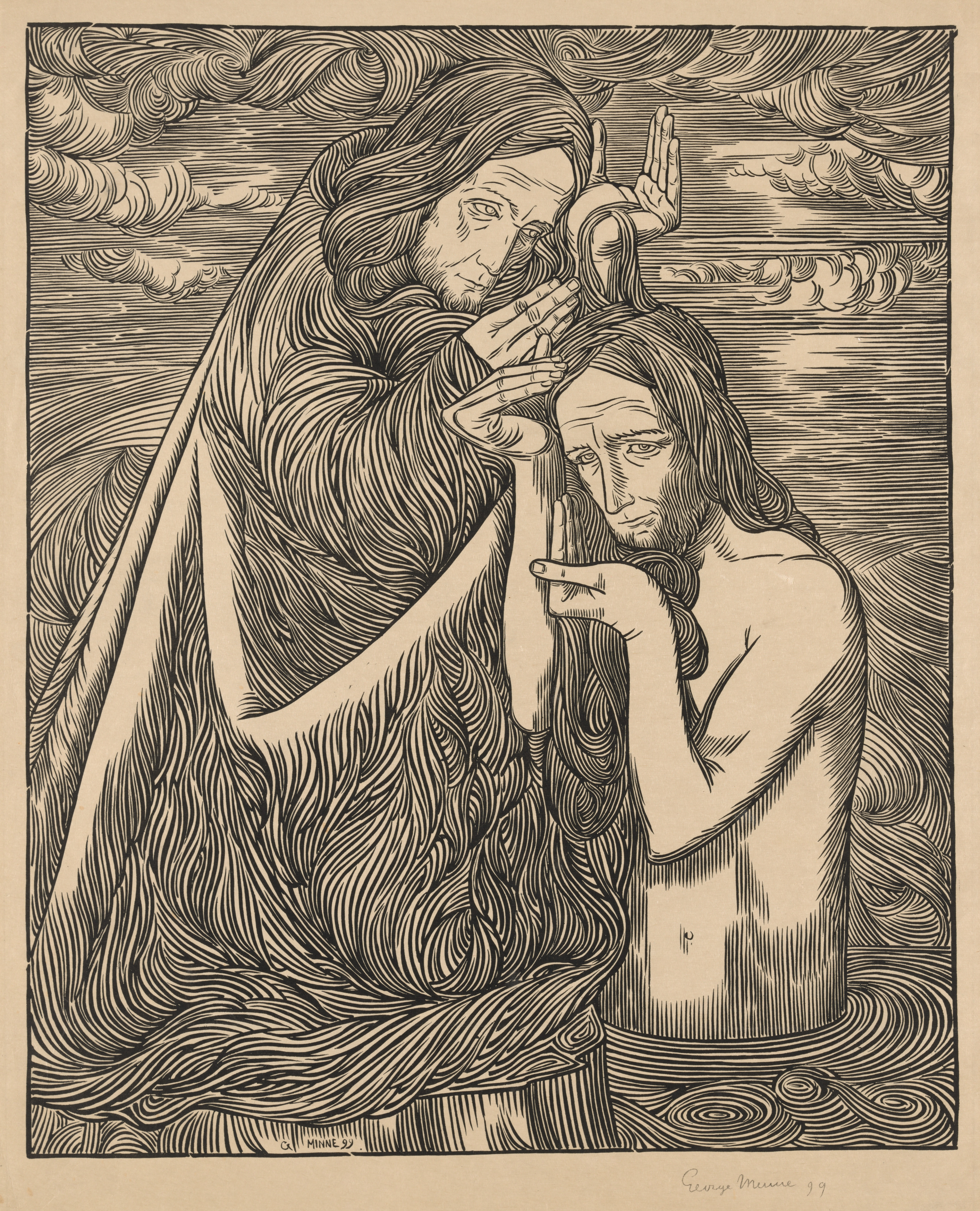 The Baptism of Christ by George Minne: The image depicts a black and white drawing of two men. The man on the left has long hair and a beard, wears a long robe, and stands in water that swirls around his legs and flows behind him like fabric. His right hand holds the head of the other man. The man on the right has long hair and a beard and is bare-chested. He stands in water that swirls around his waist. His hands are clasped together in front of his chest. The background shows a cloudy sky and water. The style is detailed and ornate.