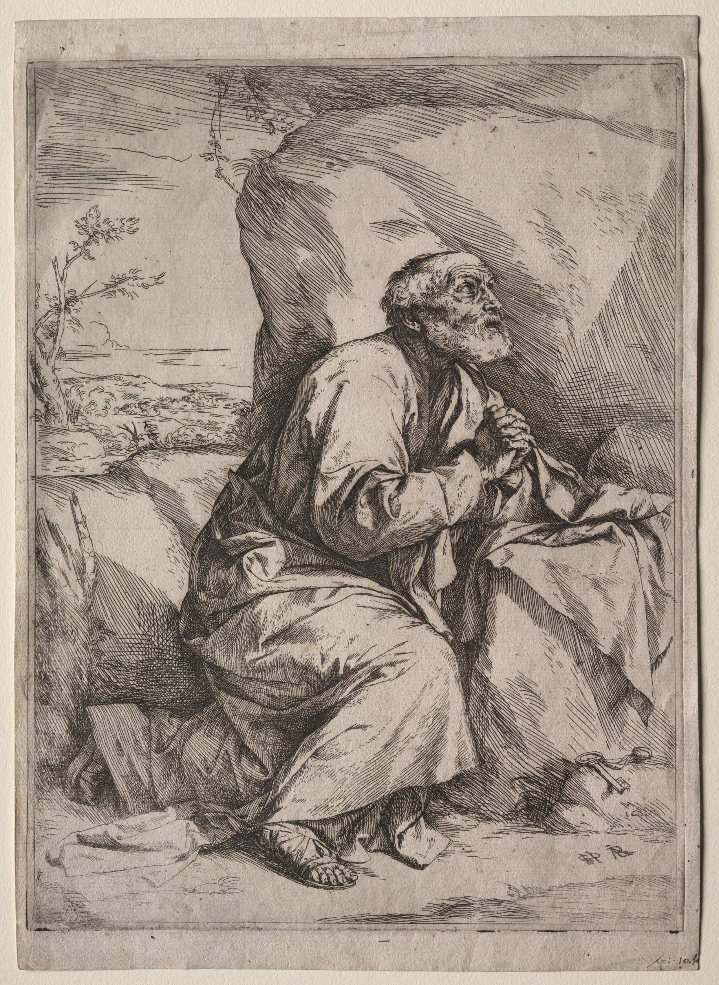 Black and white drawing of a man sitting on the ground with his knees bent and hands clasped together, looking up. The man has a white beard and balding hair. He is wearing a long robe with one leg barefoot and the other covered. The background shows a landscape with a body of water and a tree on the left, and a dark area behind the man.