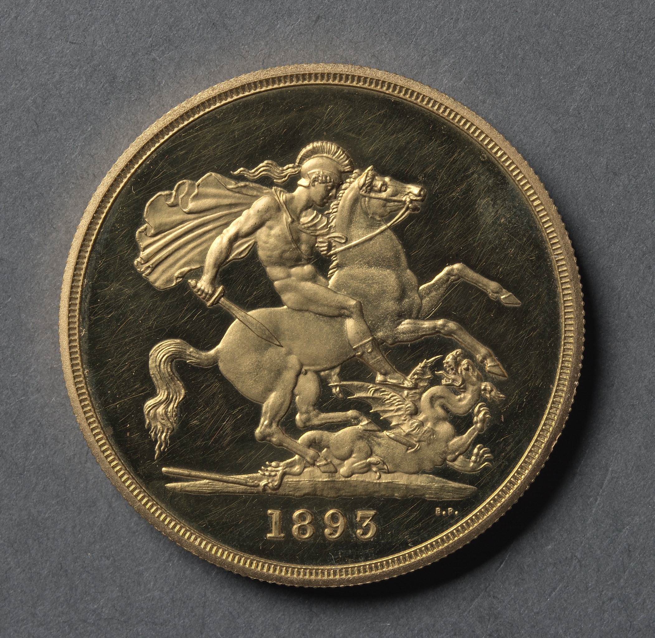 Gold coin with a raised edge, featuring a man on horseback. The man wears a helmet with a plume and a cape flowing behind him. He holds a sword in his right hand. The horse has a long tail and appears to be rearing up on its hind legs. The horse's front legs are positioned over a creature with wings, a long tail, and sharp teeth. The creature lies on its back on the ground. The year "1893" is stamped at the bottom of the coin.