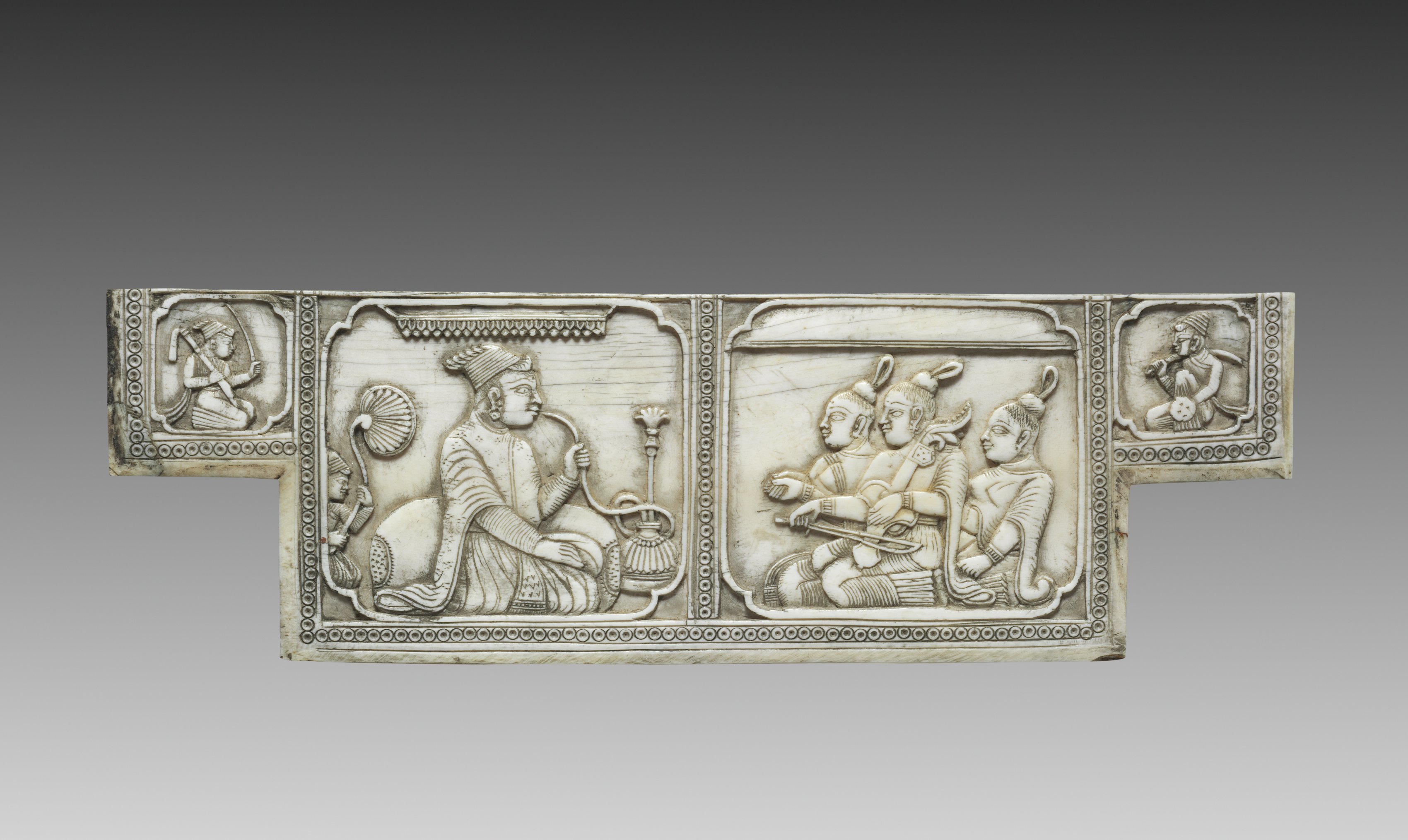 The image shows a rectangular, off-white, carved panel divided into sections. The panel is primarily composed of three main rectangular sections with smaller rectangles on either end. The left small rectangle features a figure sitting cross-legged with an object in their hands. The center-left larger rectangle depicts a man sitting cross-legged wearing a headdress and holding a hookah hose in one hand and a bowl in the other. The center-right larger rectangle shows three people sitting cross-legged; the middle person plays a stringed instrument while the other two people listen. The right small rectangle features a figure sitting cross-legged with an object in their hands. The panel's surface features ornate designs including borders of circles and scrollwork around each section. The background of the image transitions from dark gray at the top to light gray at the bottom.