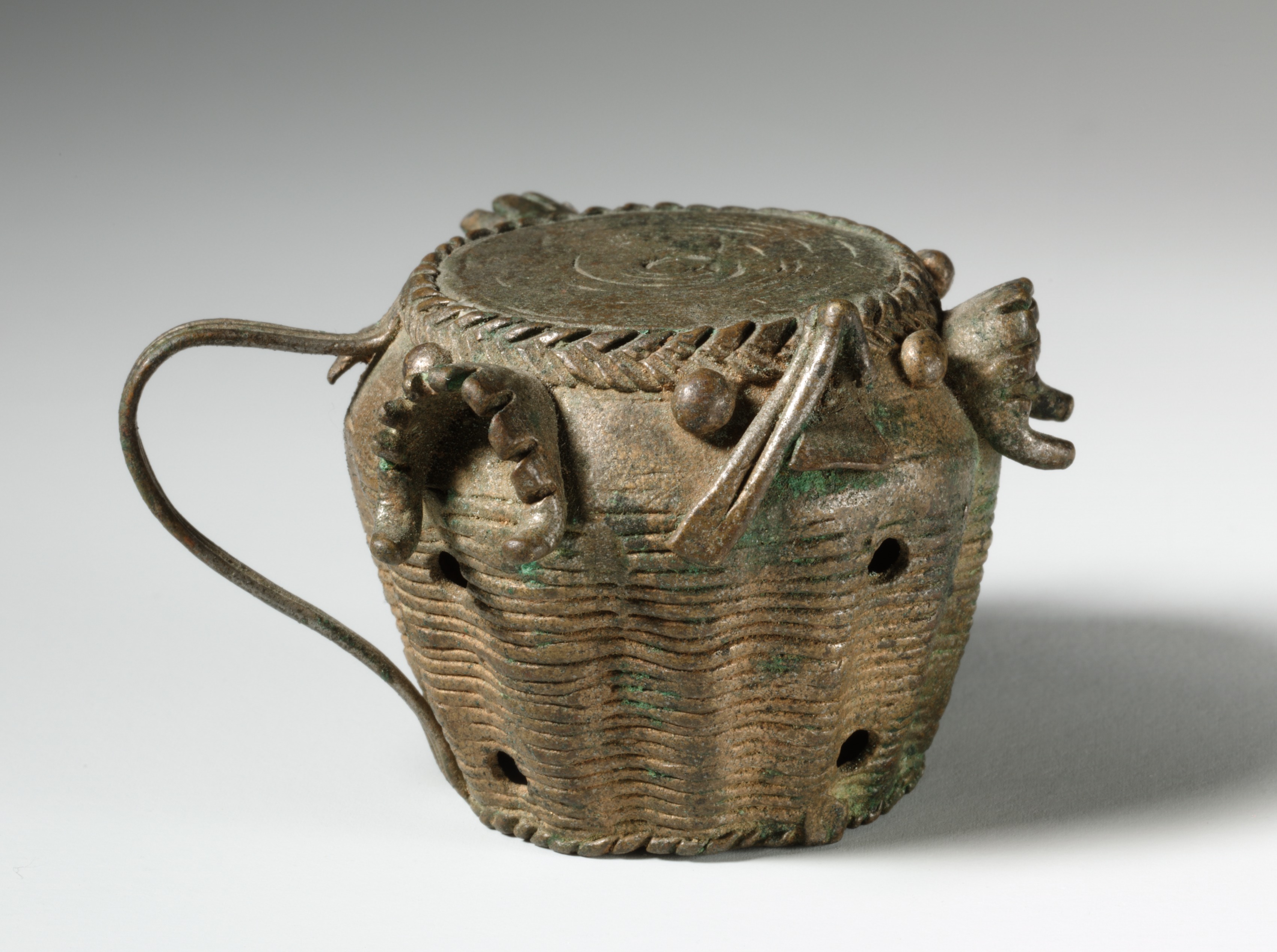 Gold Weight (abrammuo): Drum with Jaws of Defeated Enemies by Artist. Bronze object with a handle on the left side and a rounded body. The body is decorated with horizontal lines around its circumference. There are six holes of varying sizes on the body. The top of the object is flat and round with a raised edge. Protruding from the edge are four animal-like figures with open jaws. The object sits on a white surface with a shadow cast to the right. The background behind the object is gray, fading to white. The object appears to be made of bronze with a green patina visible. The overall shape resembles a drum.