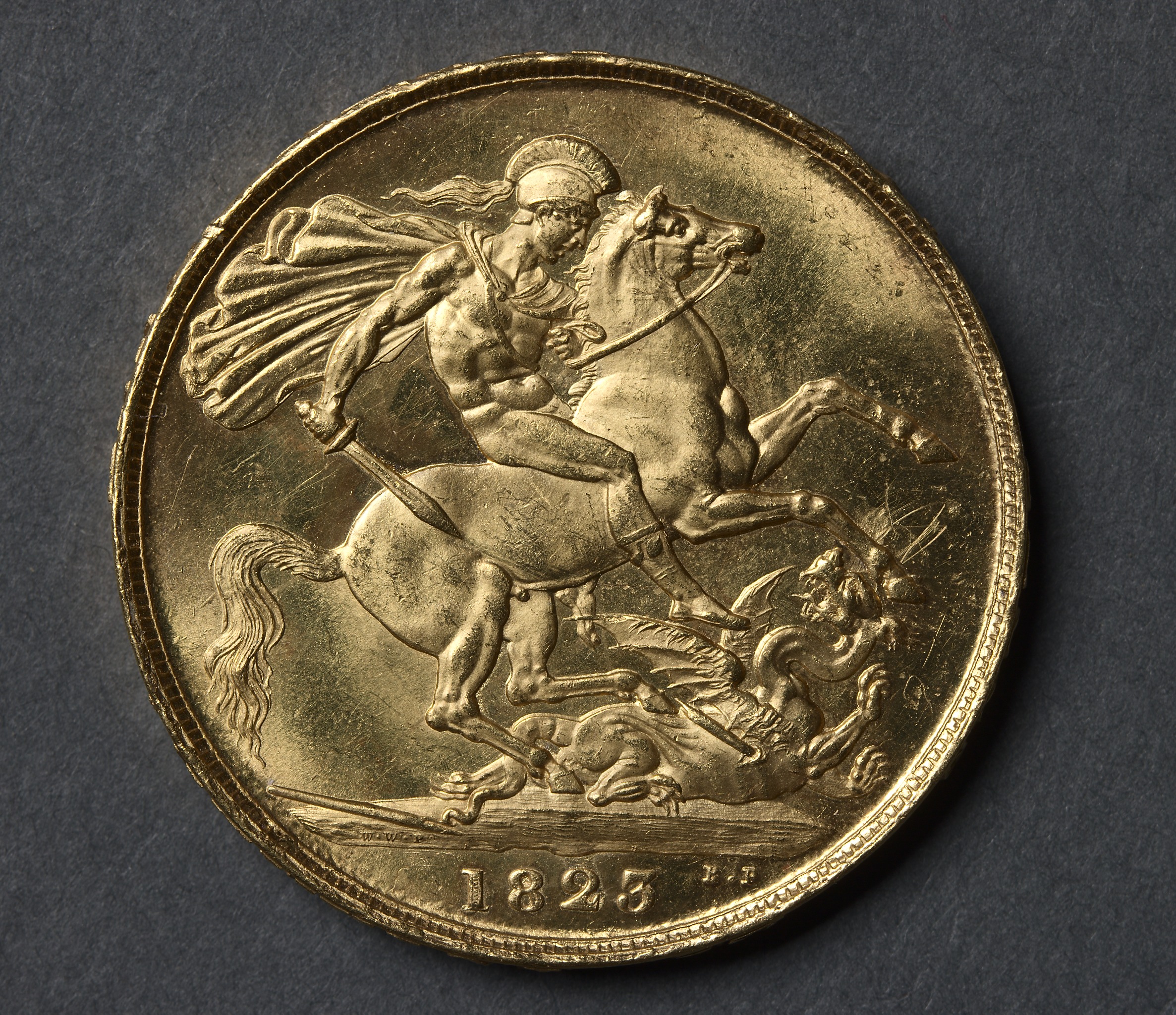 Gold coin with a raised edge, featuring a man on a horse with a cape, wearing a helmet and holding a spear; man on the horse is facing right; horse is rearing up on hind legs; horse's tail is long and flowing; under the horse is a fallen dragon-like creature; date 1825 stamped at bottom.