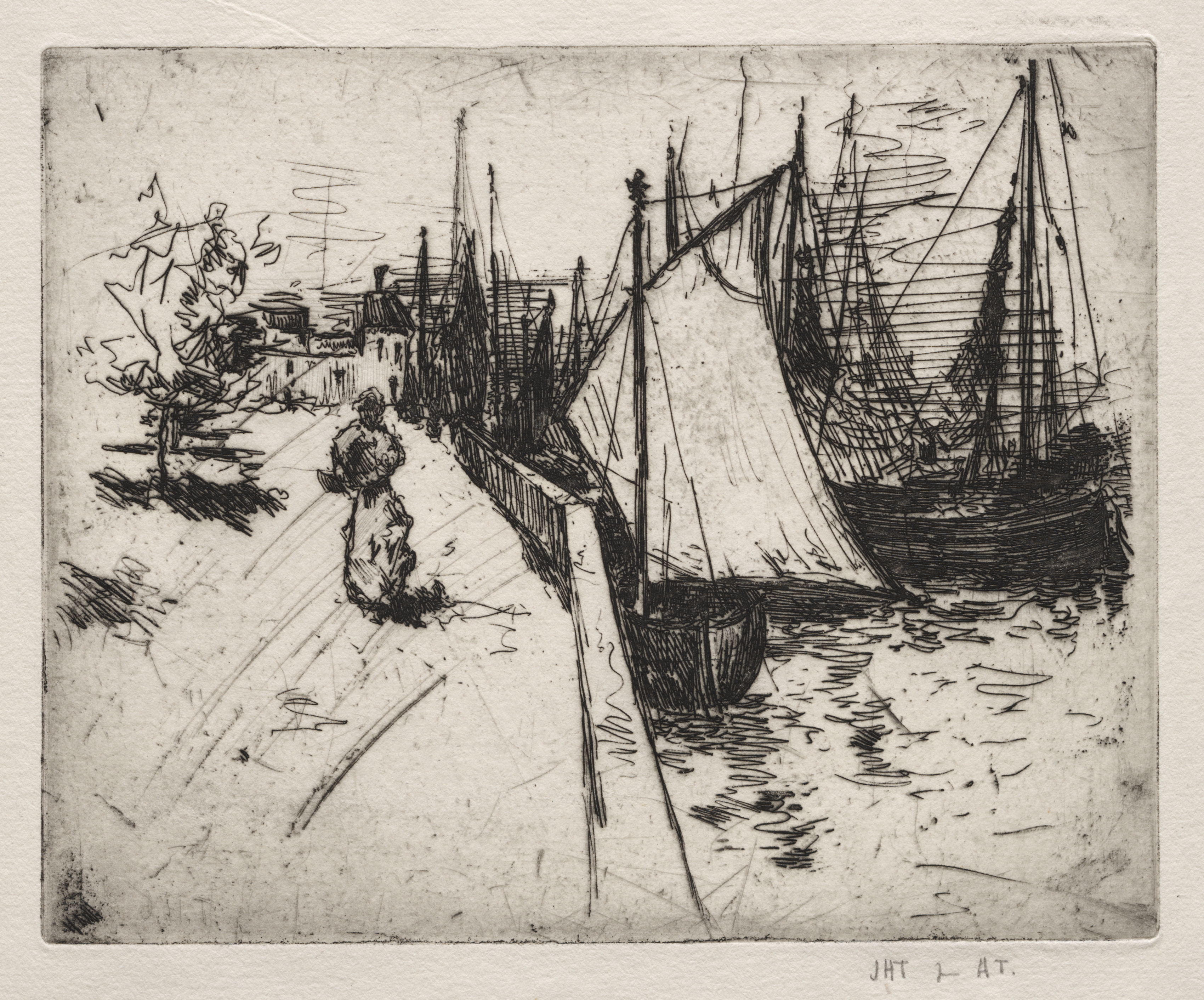 Black and white sketch of a harbour scene. A woman walks on a quay on the left side. There are boats on the water to the right. The boats have masts and rigging. One boat has a large white sail. The background shows buildings and another tree. The sky is light. The artwork is signed "JHT AT" at the bottom. The image is a landscape orientation. The artwork is in a rectangular frame with a textured border.