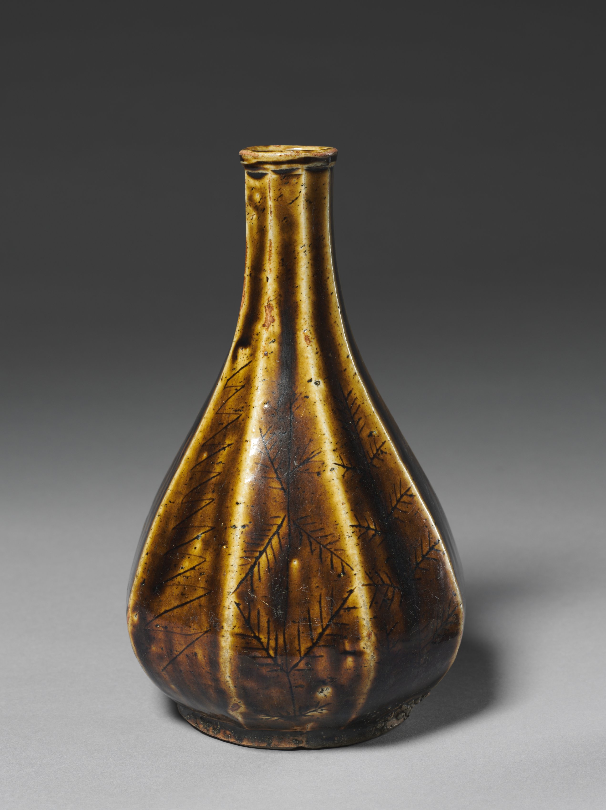 The Eight-faceted Bottle by Bernard Leach. Brown vase with eight bulbous sides; narrow cylindrical neck; etched black lines; glossy surface; dark background; shadow on bottom right.