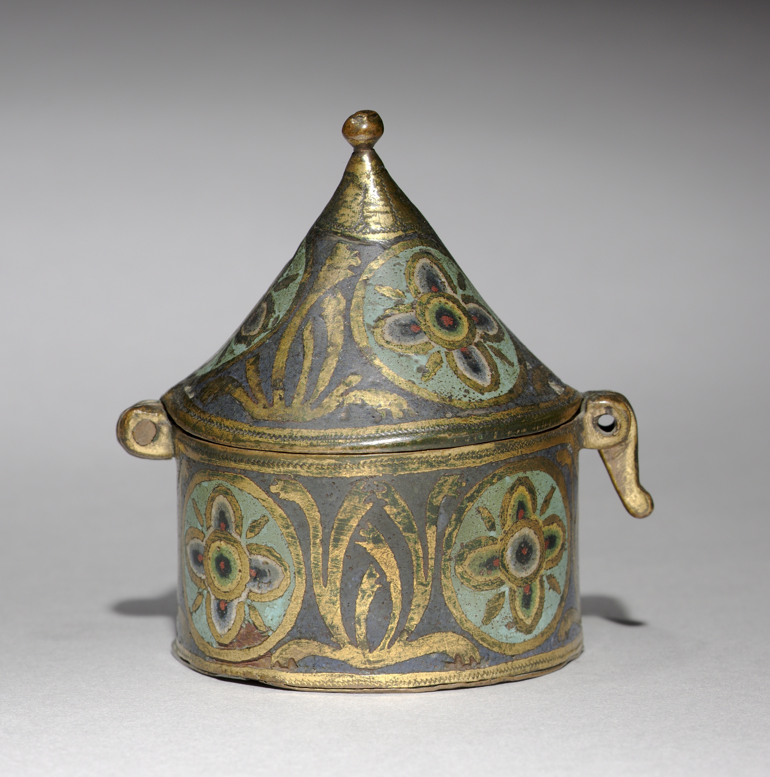 Cylindrical container with conical lid, made of metal. The container's base is cylindrical and short. The conical lid comes to a small spherical finial at its top. Two small handles protrude from either side. The surface is primarily gray with floral designs in gold, teal, and red. The background of the image is grey and white.