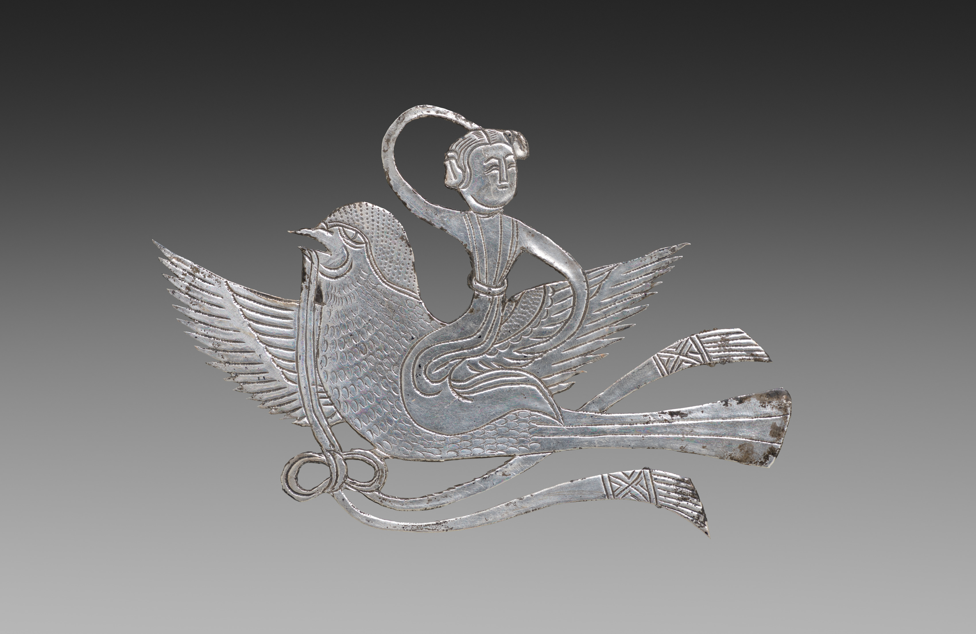 The metal plaque depicts a woman sitting on a bird. The woman's hair is short and styled up. She wears a dress with a belt around her waist. A ribbon-like object loops from her head and attaches to the bird's beak. The bird has its wings outstretched and appears to be flying. The bird's tail feathers are long and patterned. The plaque has a silver color with some darker spots, possibly due to aging or damage. The background of the image is a gradient from dark gray to light gray.