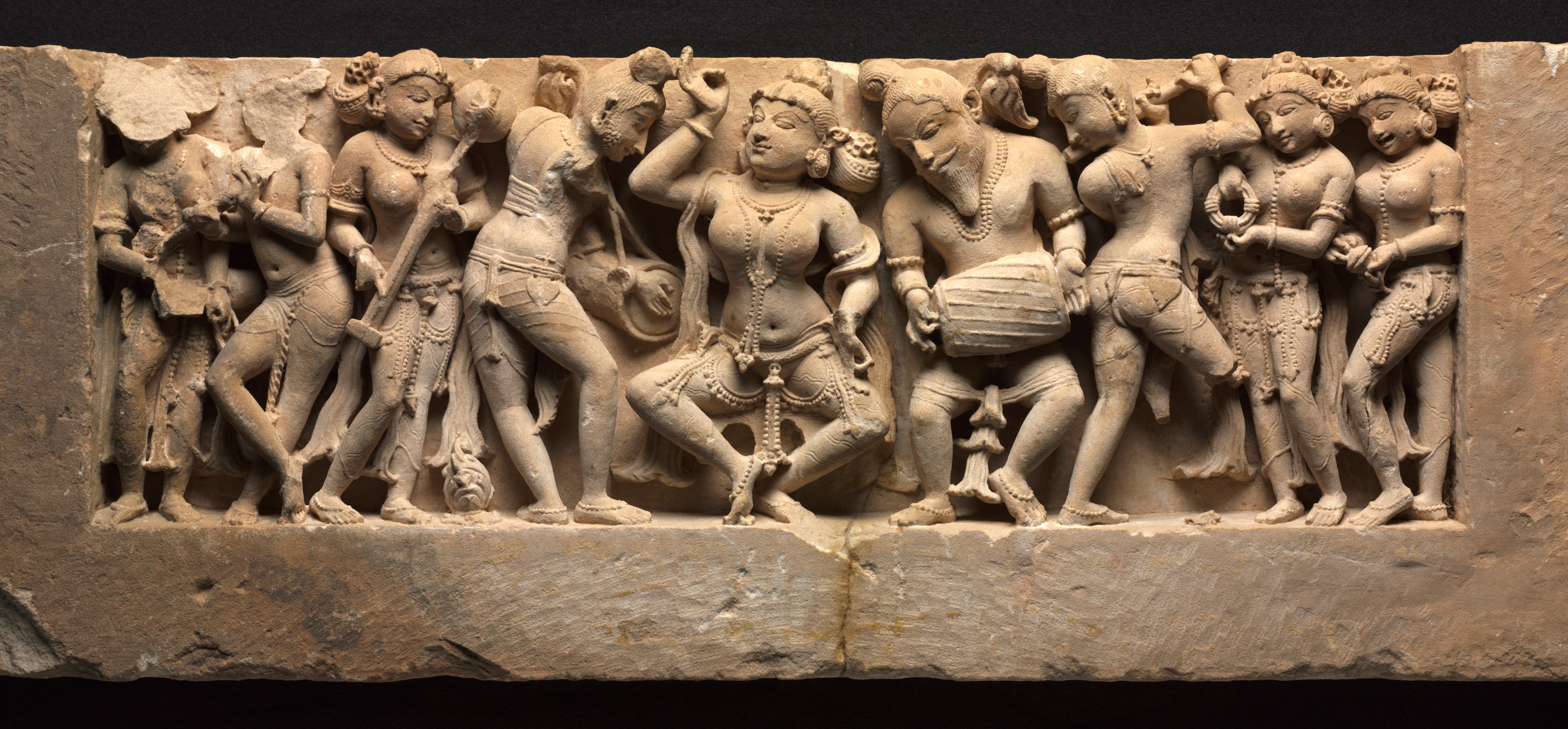 The sculpture depicts a frieze with multiple figures. A central female figure dances prominently in the middle. She wears a necklace and a short dhoti. Her right leg is bent, and her left leg is extended. Her right arm is bent near her head, and her left arm is bent across her body. To her left, a male figure plays a drum. He has a beard and wears a necklace and short dhoti. Other male and female figures are carved around the central dancer. Some play musical instruments. The figures wear necklaces, and most wear short dhotis. The sculpture is carved from a single block of stone and has a rough, unfinished texture. It appears to be a section of a larger carving. The color of the stone is light brown.