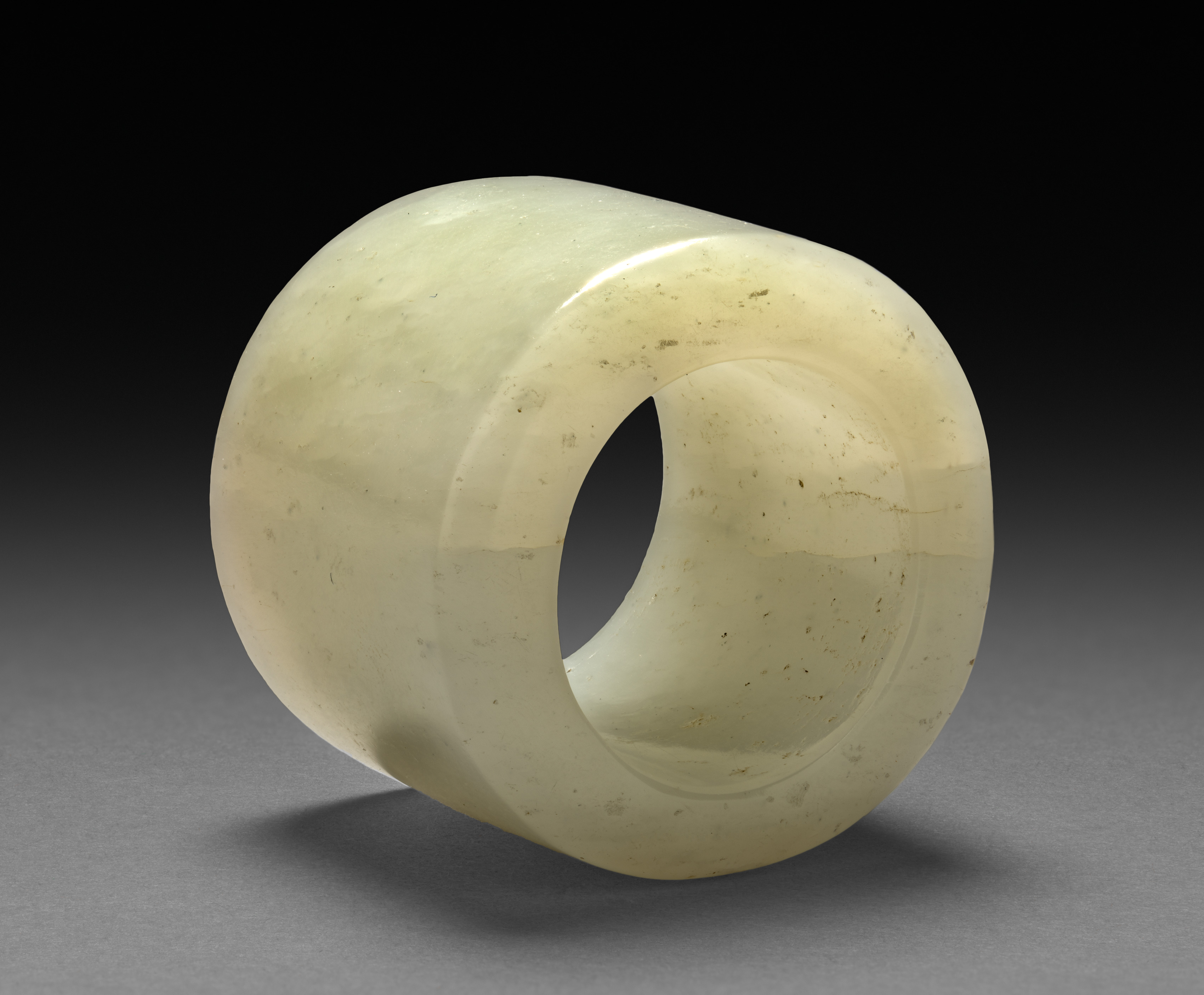 Pale green ring with darker green flecks, rounded rectangular in cross-section; rounded corners; inner and outer edges smooth; thick rounded band; stone appears smooth and polished; sits on flat surface against dark background. Thumb Ring, Wang Fu.