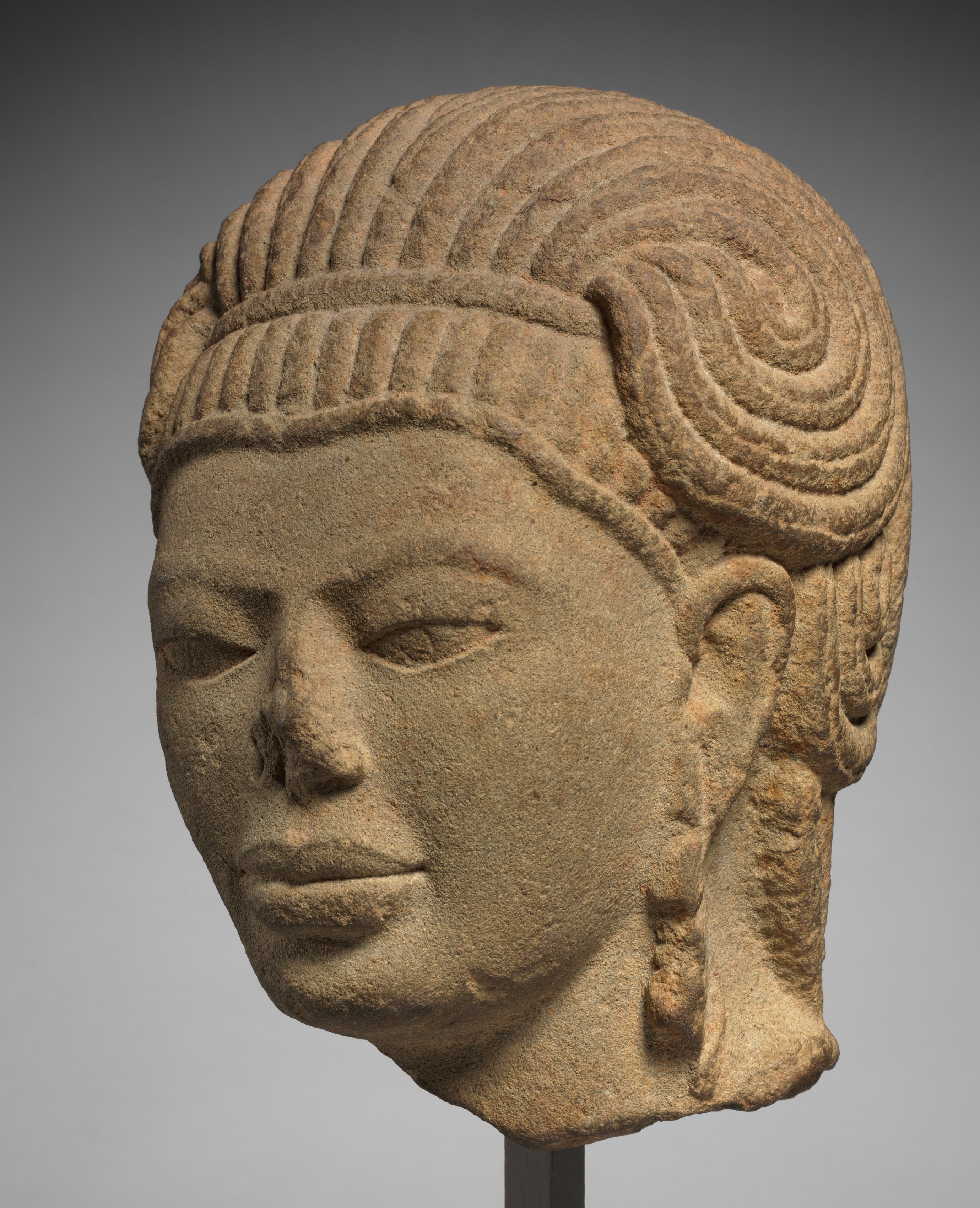 The Head of Male Deity possibly Aiyanar, is a stone sculpture. The sculpture features a head with a serene expression. The head is tilted slightly to the left. The hair is styled in an intricate design, with lines and swirls carved into it. The forehead is smooth with no prominent features. The eyes are closed or half-closed. The nose is straight and proportional to the rest of the face. The mouth is closed with a subtle curve suggesting a gentle smile. The skin texture appears rough, indicating it is made of stone. The background of the image is a gradient transitioning from dark gray at the top to light gray at the bottom. The sculpture appears to be mounted on a black pole.